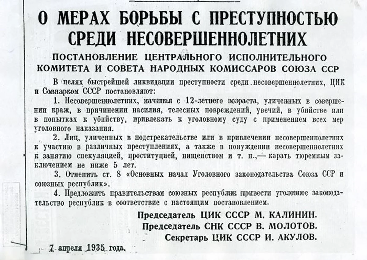 Вопрос о расстреле несовершеннолетних еще раз обсудили на заседании Политбюро ЦК ВКП(б) 26 апреля 1935 года. Судя по подписанному Сталиным протоколу заседания, среди прочих тем в повестке дня значилась и такая: «О мерах борьбы с преступностью среди несовершеннолетних». Там же недвусмысленное пояснение: к числу мер уголовного наказания в отношении малолетних преступников «относится также и высшая мера (расстрел)».