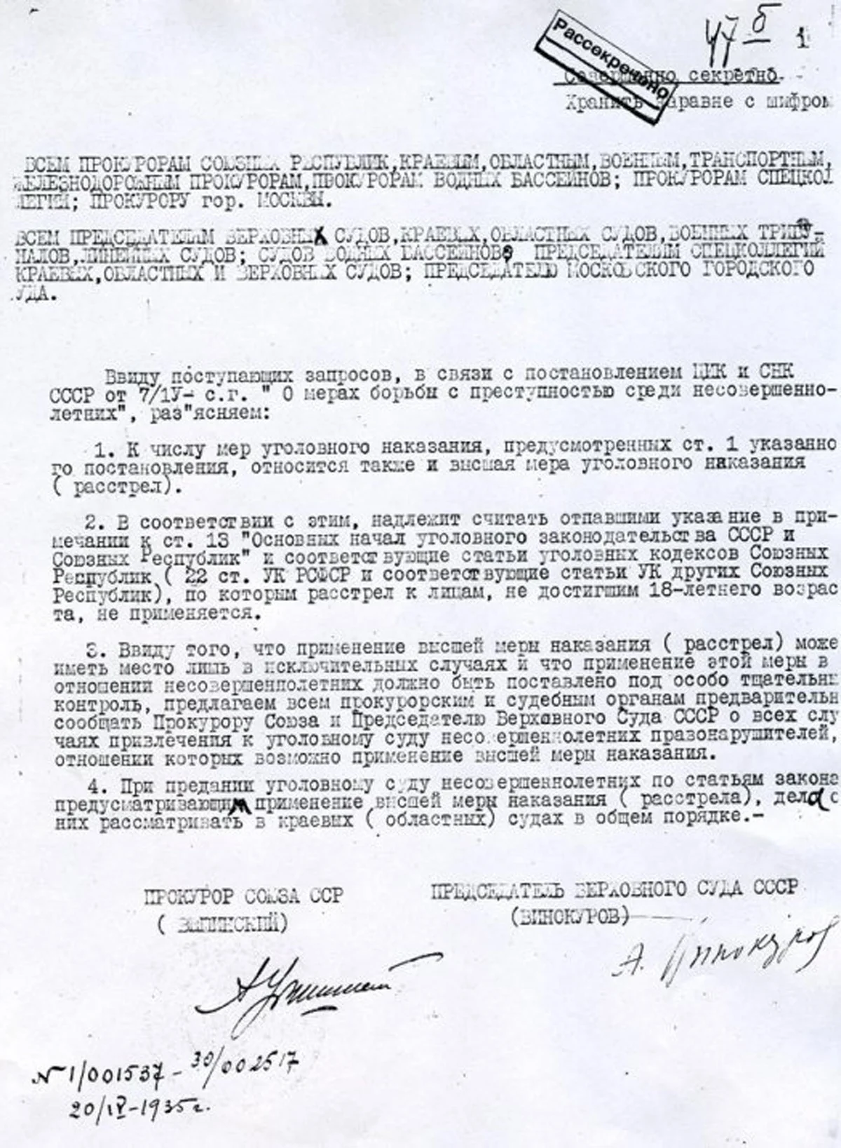 Сталин всегда поддерживал простые решения. И 20 апреля 1935 года прокурор СССР Андрей Вышинский и председатель Верховного суда СССР Александр Винокуров подписали специальное разъяснение за № 1/001537–30/002517 под грифом «Совершенно секретно», где расстрелы оговаривались конкретно: