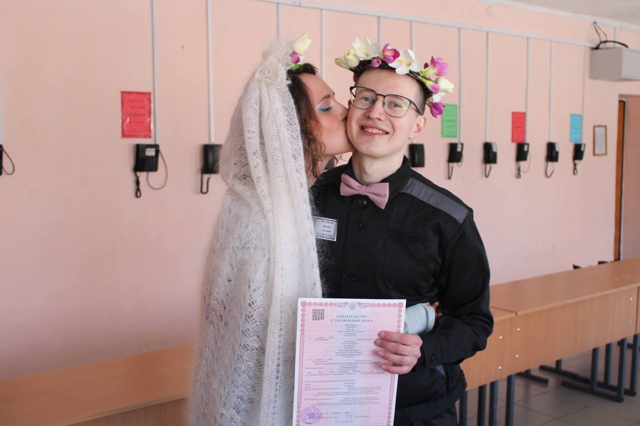 Вместе с нами в комнате были работница ЗАГСа и сотрудник колонии с фотоаппаратом. Сразу после церемонии они нам дали время пообщаться. И мы с Витей пять минут целовались.