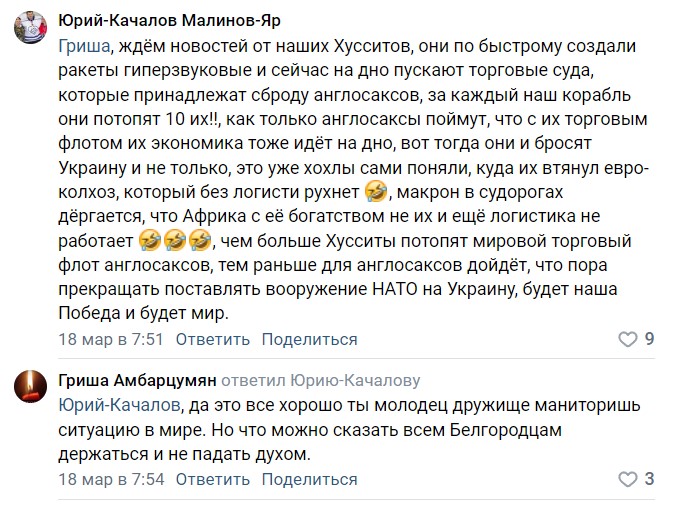 Утешение и надежду соотечественникам дарит пенсионер 1944 года рождения Юрий Качалов, рекламирующий на своей странице аренду загородных домов для отдыха. Под каждым постом губернатора он доходчиво объясняет, что СВО – это не война между Белгородом и Харьковом, а то "уже давно бы порешали и пили водку", это все англосаксы, США и евро-колхоз. Но не все потеряно: во-первых, "тех вампиров пол состава осталось, больше их поставлять не будут" (речь про реактивную систему залпового огня калибра RM-70 Vampire, которой обстреливали Белгородскую область), а во-вторых, скоро хуситы потопят весь англосакский торговый флот, и страны НАТО, испугавшись, резко прекратят поставлять оружие в Украину.