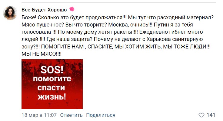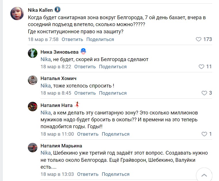 "Боже! Сколько это будет продолжаться!!! Мы тут что расходный материал? Мясо пушечное? Вы что творите? Москва, очнись!!! Путин я за тебя голосовала !!! По моему дому летят ракеты!!!! Ежедневно гибнет много людей !!!! Где наша защита? Почему не делают с Харькова санитарную зону?!!! ПОМОГИТЕ НАМ , СПАСИТЕ, МЫ ХОТИМ ЖИТЬ, МЫ ТОЖЕ ЛЮДИ!!! МЫ НЕ МЯСО!!!!" – редкий крик души от пользователя с ником "Все-Будет Хорошо". Риторическими вопросами белгородцы не злоупотребляют. Выводы уже сделаны: "Белгородская область стала разменной монетой для достижения высших целей, а на людей плевать".