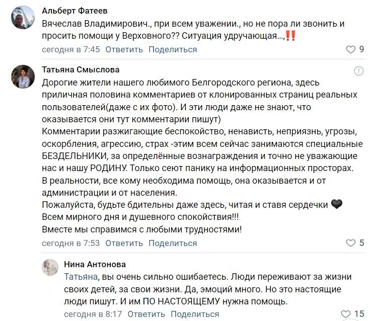 Но мало того что про обстрелы не говорят по телевизору, так еще и в интернете обвиняют в "ципсо" (популярное сокращение от наименования подразделения ВСУ – " Центр информационно-психологических операций Украины"). Ципсошниками обзывают белгородцев в пабликах других регионов, куда те приходят жаловаться на прифронтовую жизнь. Но и друг друга белгородцы порой подозревают в том же самом. "Комментарии, разжигающие беспокойство, ненависть, неприязнь, угрозы, оскорбления, страх – этим всем сейчас занимаются специальные БЕЗДЕЛЬНИКИ, за определенные вознаграждения и точно не уважающие нас и нашу РОДИНУ", – обращается к согражданам Татьяна Смыслова. Ей отвечают, что она сильно ошибается.