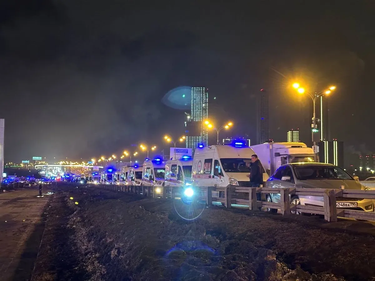 Десятки «скорых» с включёнными мигалками от «Крокуса» стоят вдоль дороги. Всех просят уйти дальше.