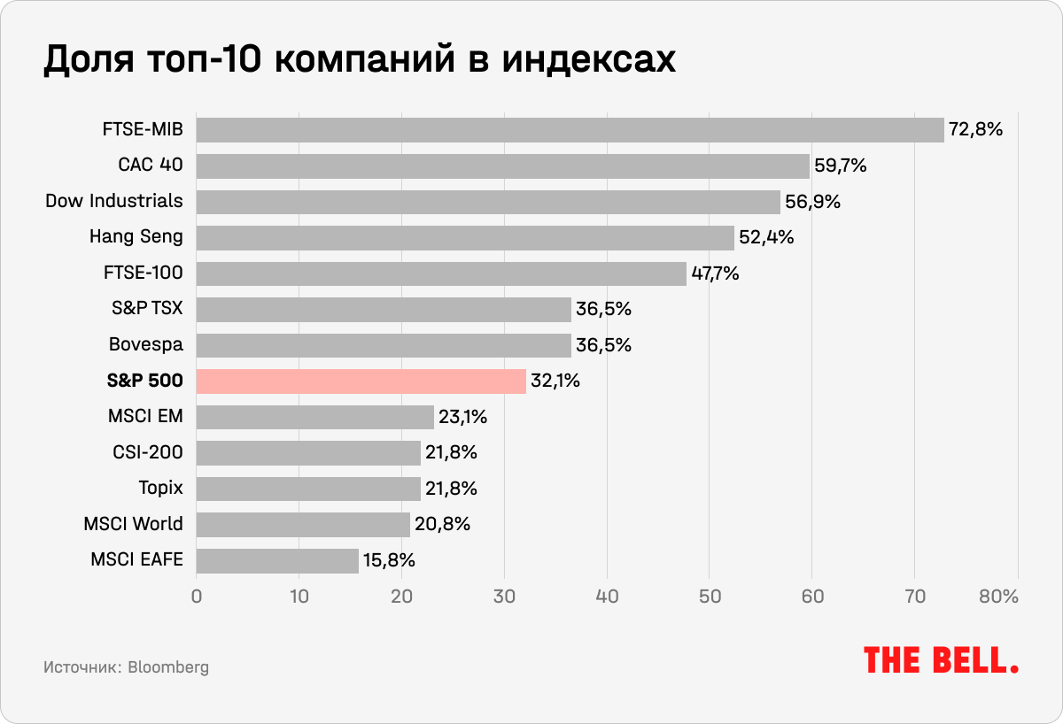 К этому же выводу приходит Bloomberg, сравнивая концентрацию S&P 500 с другими мировыми бенчмарками. Это сравнение, вероятно, более важно, чем по странам: многие инвесторы выбирают между фондами, которые следуют либо за S&P 500, либо за одним из индексов MSCI: всего мира (World) или развивающихся стран (MSCI EM).
