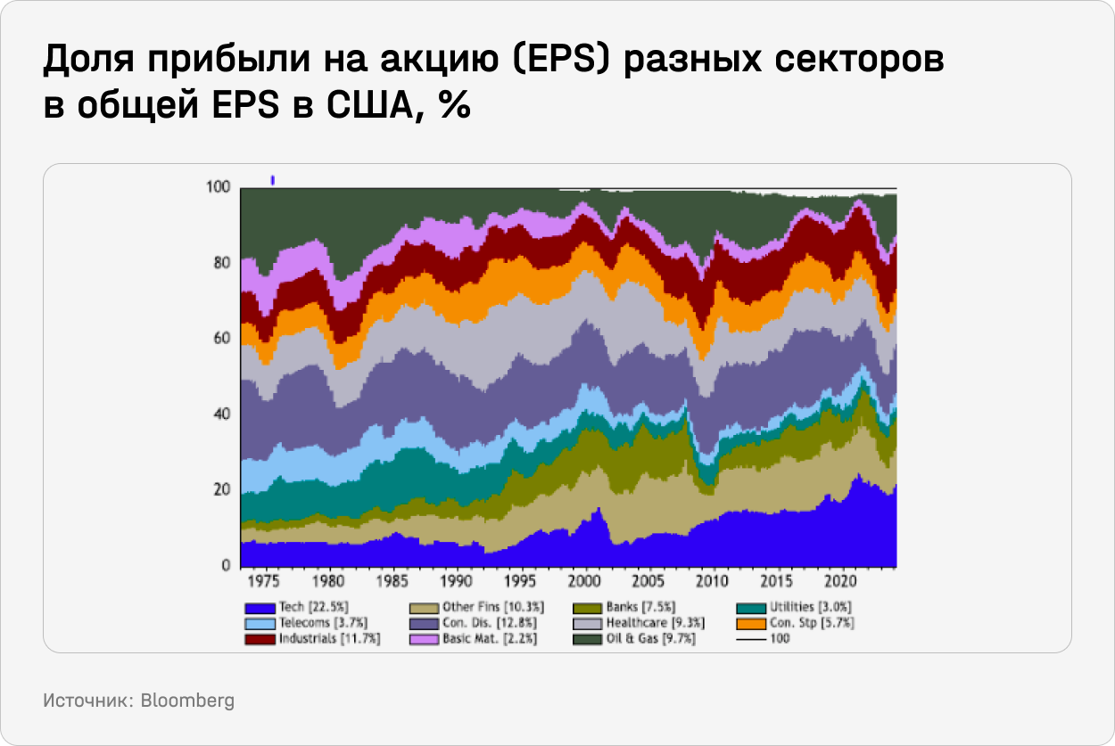 Рынки могут «галлюцинировать» по поводу будущих прибылей и выручки технологических компаний, цитирует Bloomberg стратега из Absolute Strategy Research. По его расчетам, на технологический сектор приходится уже 23% прибыли всего рынка. За последние 50 лет только секторам энергетики (1980 год), здравоохранения (1992) и потребительских товаров длительного пользования (1978 и 2017 годы) удавалось превосходить отметку в 20% — и то на короткое время. О том, какие объективные факторы способствуют тому, что лидирующие компании редко сохраняют свое положение, мы расскажем ниже.