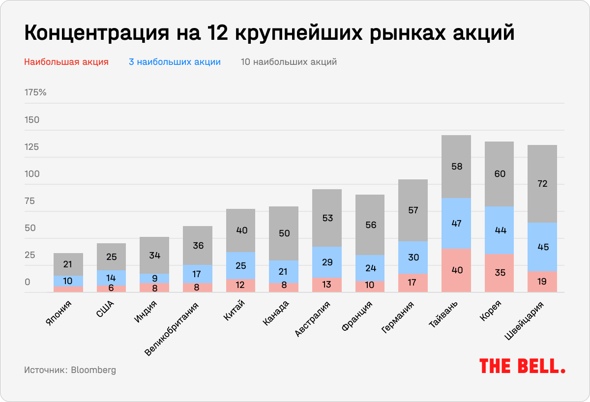 Текущую рыночную концентрацию необходимо поместить в контекст, считают авторы вышедшего недавно 25-го ежегодного Global Investment Returns Yearbook — известные ученые Элрой Димсон, Пол Марш и Майк Стонтон. Они анализируют данные по доходности финансовых рынков разных стран начиная с 1900 года. Что интересно, по сравнению с другими рынками американский прямо сейчас не выглядит таким уж сконцентрированным, отмечают они.