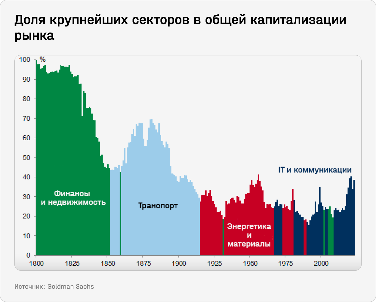 Исторически текущая концентрация также не выглядит беспрецедентной. Как отмечают авторы Global Investment Returns Yearbook, концентрация американского рынка в акциях железных дорог в 1900 году была выше, чем сейчас в бумагах технологических компаний. Это же хорошо показано в свежем исследовании Goldman Sachs (GS). На протяжении последних 200 лет наибольшую долю на рынке занимали отрасли, являвшиеся драйвером экономического роста, — и в прошлом на них приходилась еще большая доля рынка.