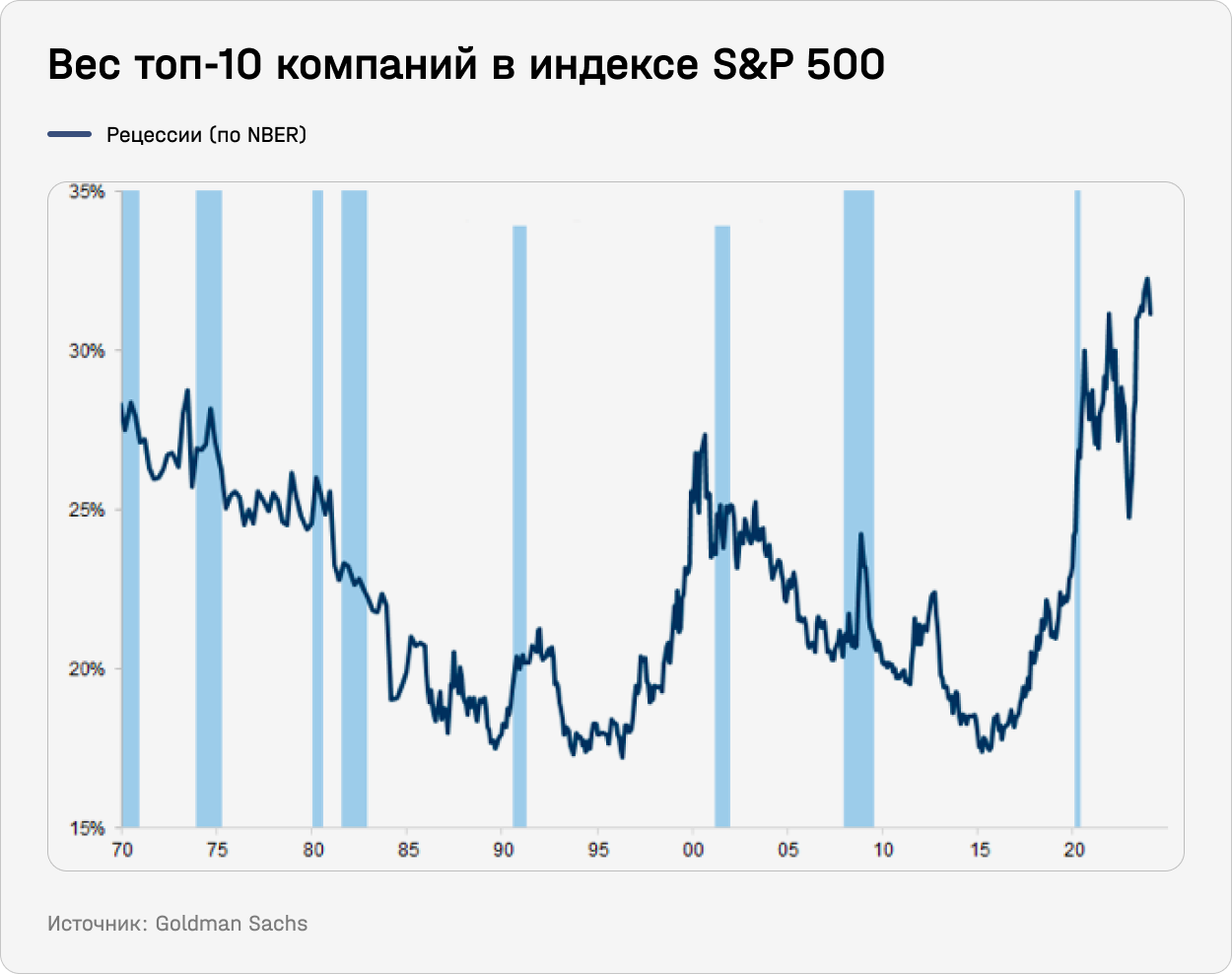По некоторым параметрам — например, весу топ-10 компаний — концентрация уже превзошла показатели пузыря доткомов (32% сейчас против 27% на пике в феврале 2000-го) и достигла максимума с 1980 года. Это делает индексы более уязвимыми к ситуации всего в нескольких компаниях, создавая риски и для пассивных инвесторов. Некоторые стратеги западных инвестбанков напрямую предупреждают об опасности пузыря вследствие высоких оценок технологических компаний (1, 2).