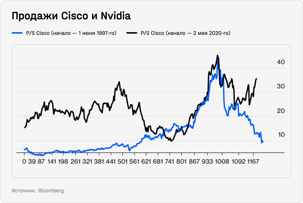 При этом рынки сейчас прайсят акции компании с расчетом на то, что такие высокие темпы роста сохранятся. Тут тоже есть параллели с Cisco: обе компании начали расти за год до пика оценки. Разница в том, что затем оценки Cisco снизились, а Nvidia после небольшого снижения снова вернулись к росту.