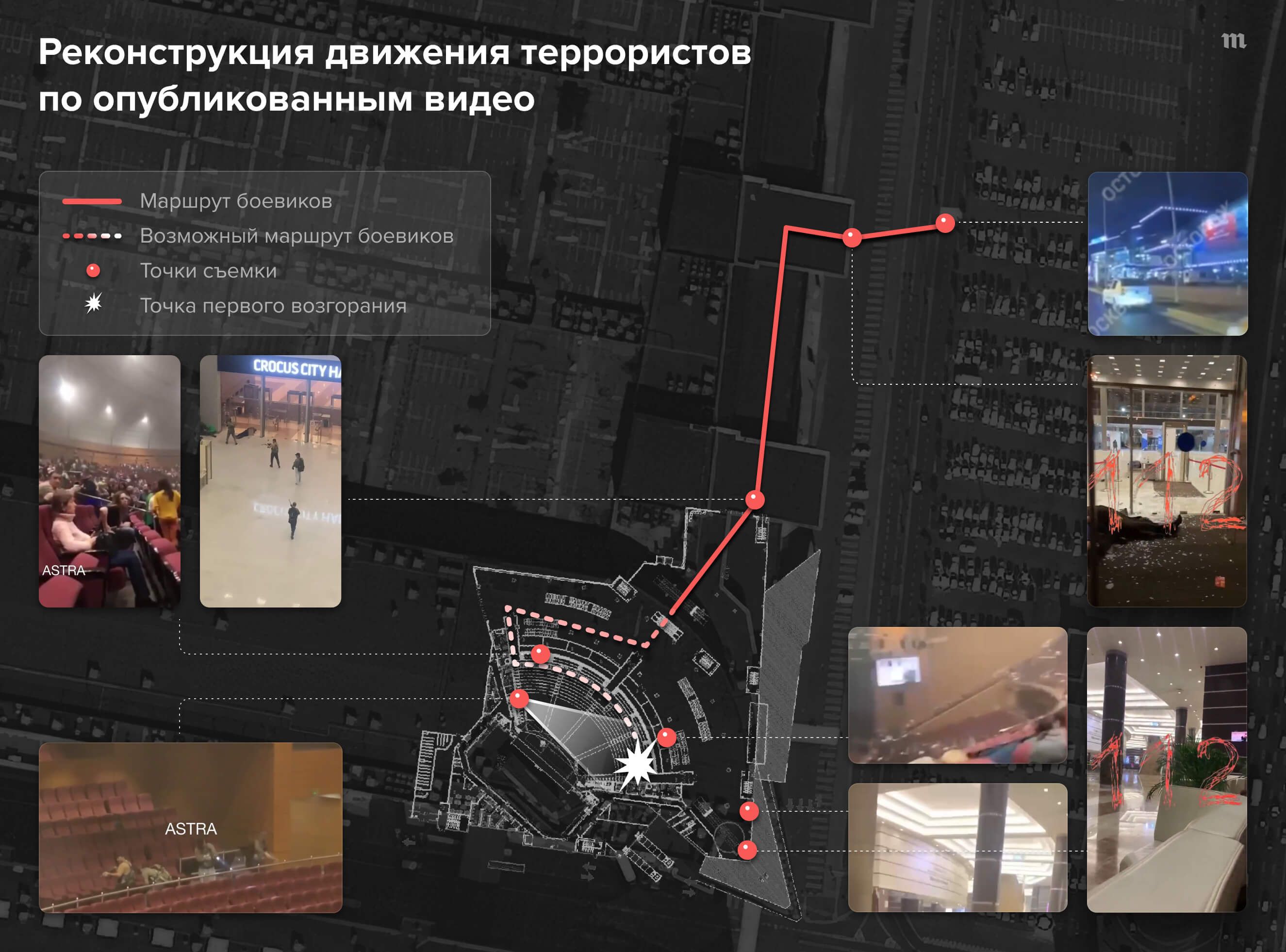 На основании опубликованных видеоматериалов «Медуза» восстановила маршрут движения террористов в «Крокус Сити Холле». Из того, что известно по состоянию на вечер 23 марта, картина выглядит следующим образом.