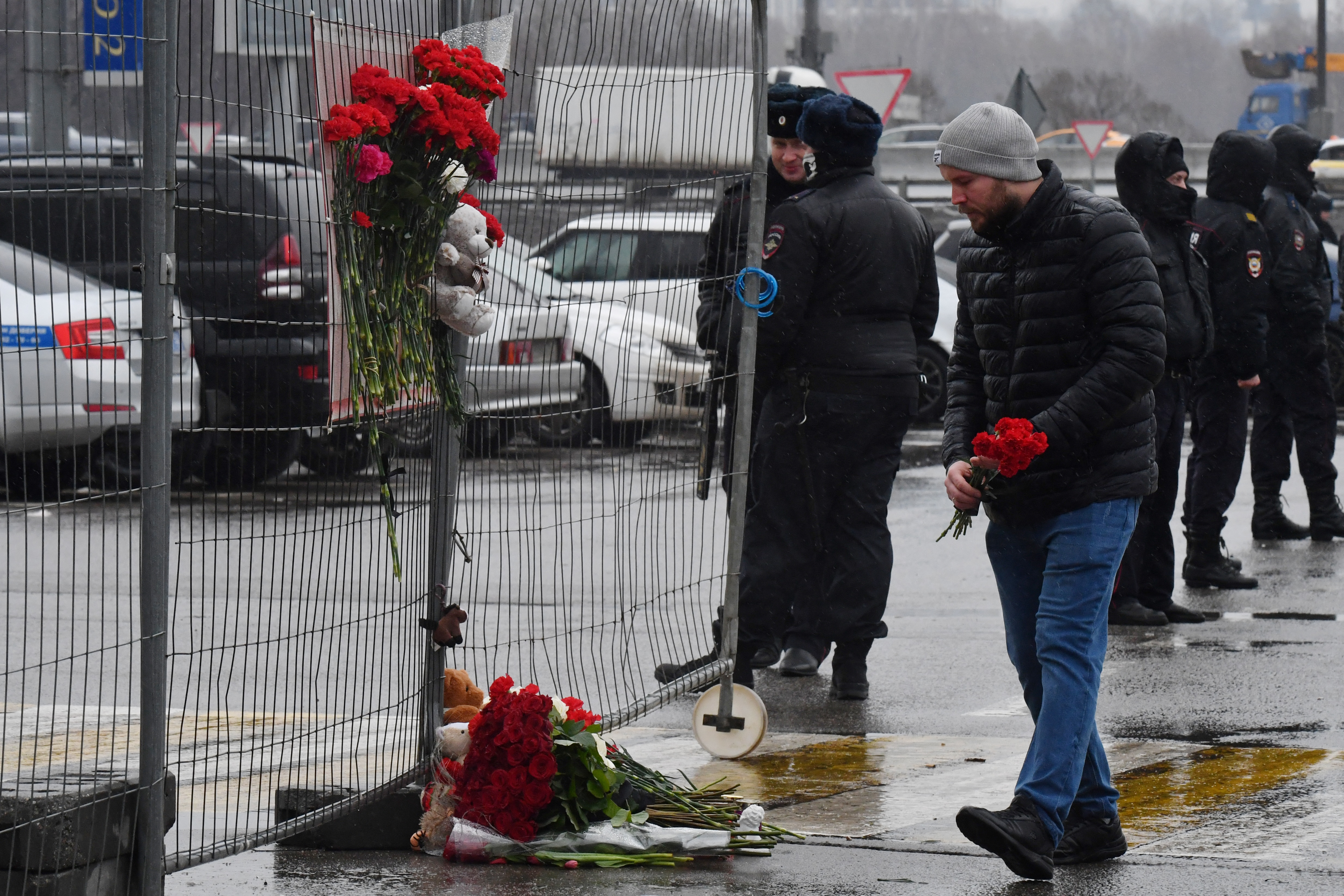 У ограждения возле "Крокус Сити Холла", где во время вчерашнего вооружённого нападения и последовавшего за ним пожара погибли не менее 115 человек, возник стихийный мемориал. Люди приносят цветы и детские игрушки.