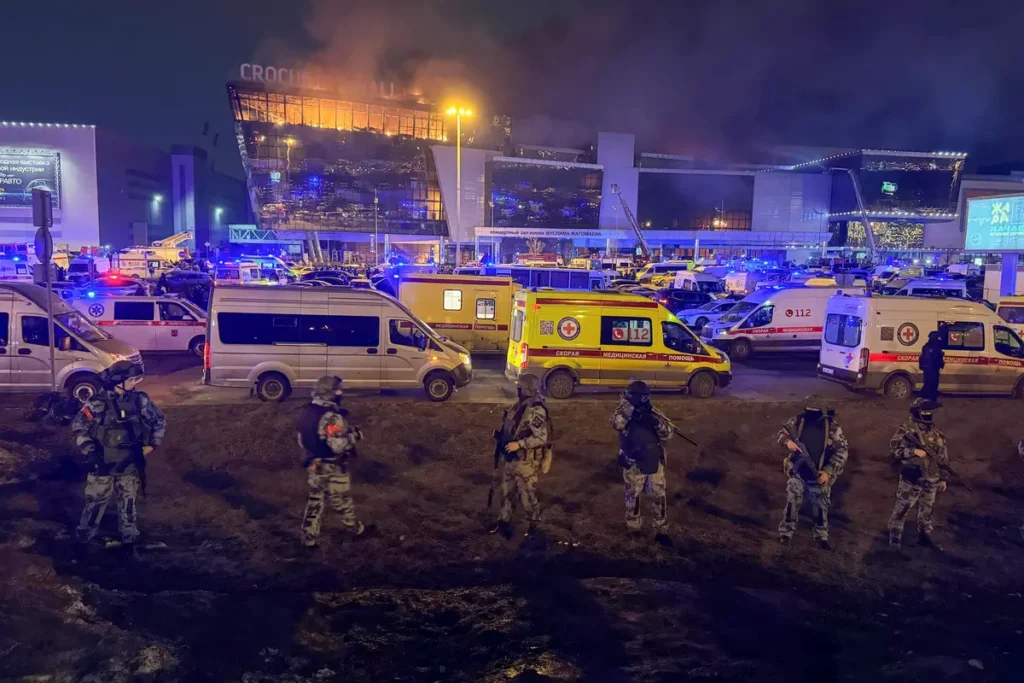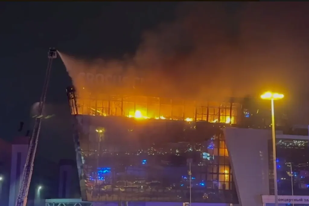 К 20:30 к зданию подъехали машины скорой помощи. В это же время в «Крокусе» начался пожар. Как рассказали очевидцы, нападавшие подожгли кресла концертного зала, из-за чего огонь распространился по помещению и дошёл до крыши. К тому моменту, как писала Baza, погибли уже 12 человек, 35 пострадали.