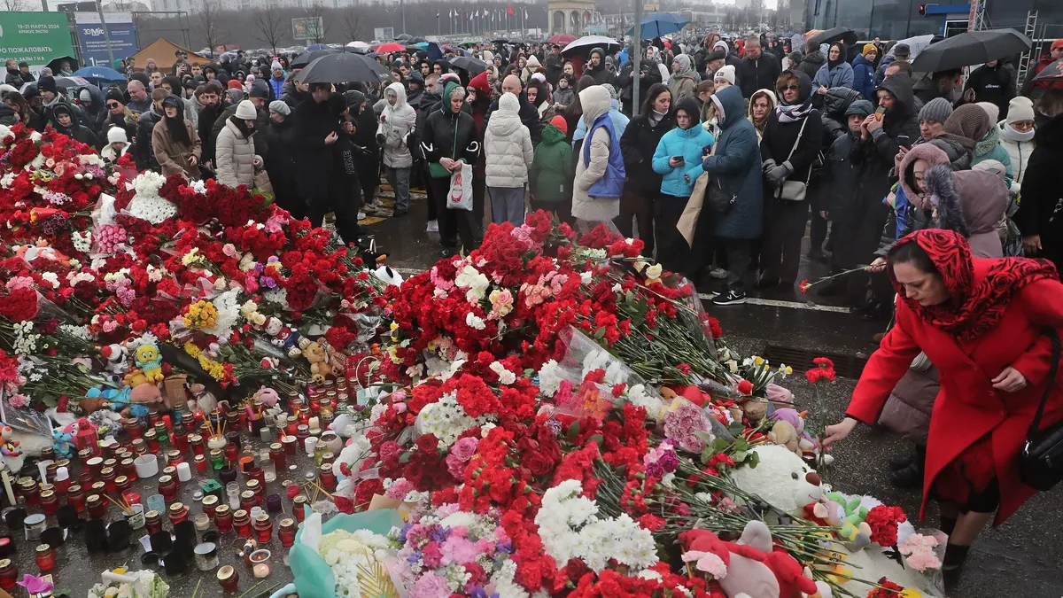 Скорбящие у стихийного мемориала из цветов у концертной площадке "Крокус Сити Холл" после теракта в Красногорске, Подмосковье, Россия, 24 марта 2024 года. Фото: Максим Шипенков/EPA-EFE