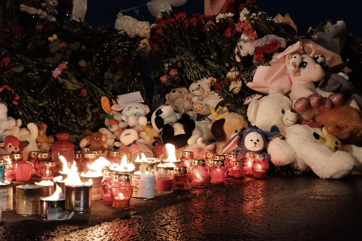 Цветы, свечи и игрушки около концертной площадки "Крокус Сити Холл" после теракта в Красногорске, Подмосковье, Россия, 23 марта 2024 года. Фото: Stringer