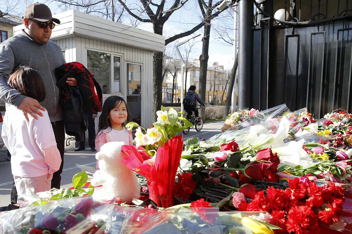Люди возлагают цветы перед посольством России в память о жертвах теракта в Крокус Сити Холле. Бишкек, Кыргызстан, 23 марта 2024 года. Фото: Игорь Коваленко/EPA-EFE