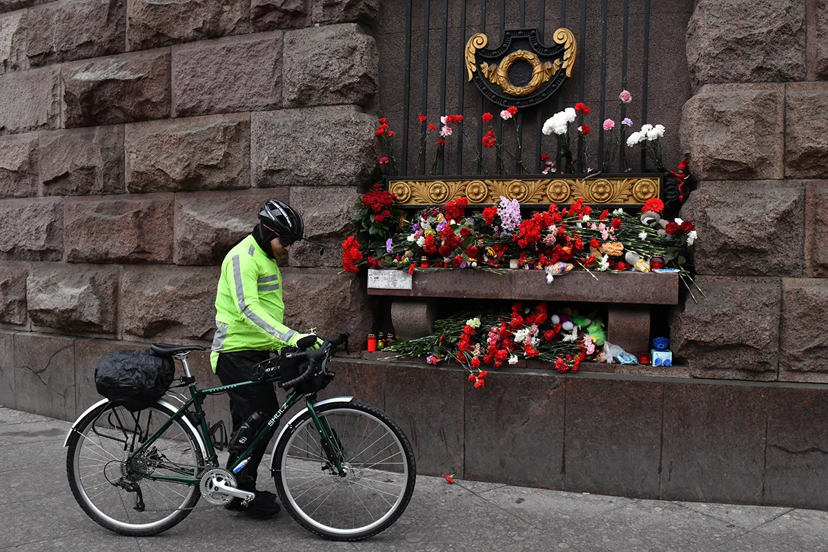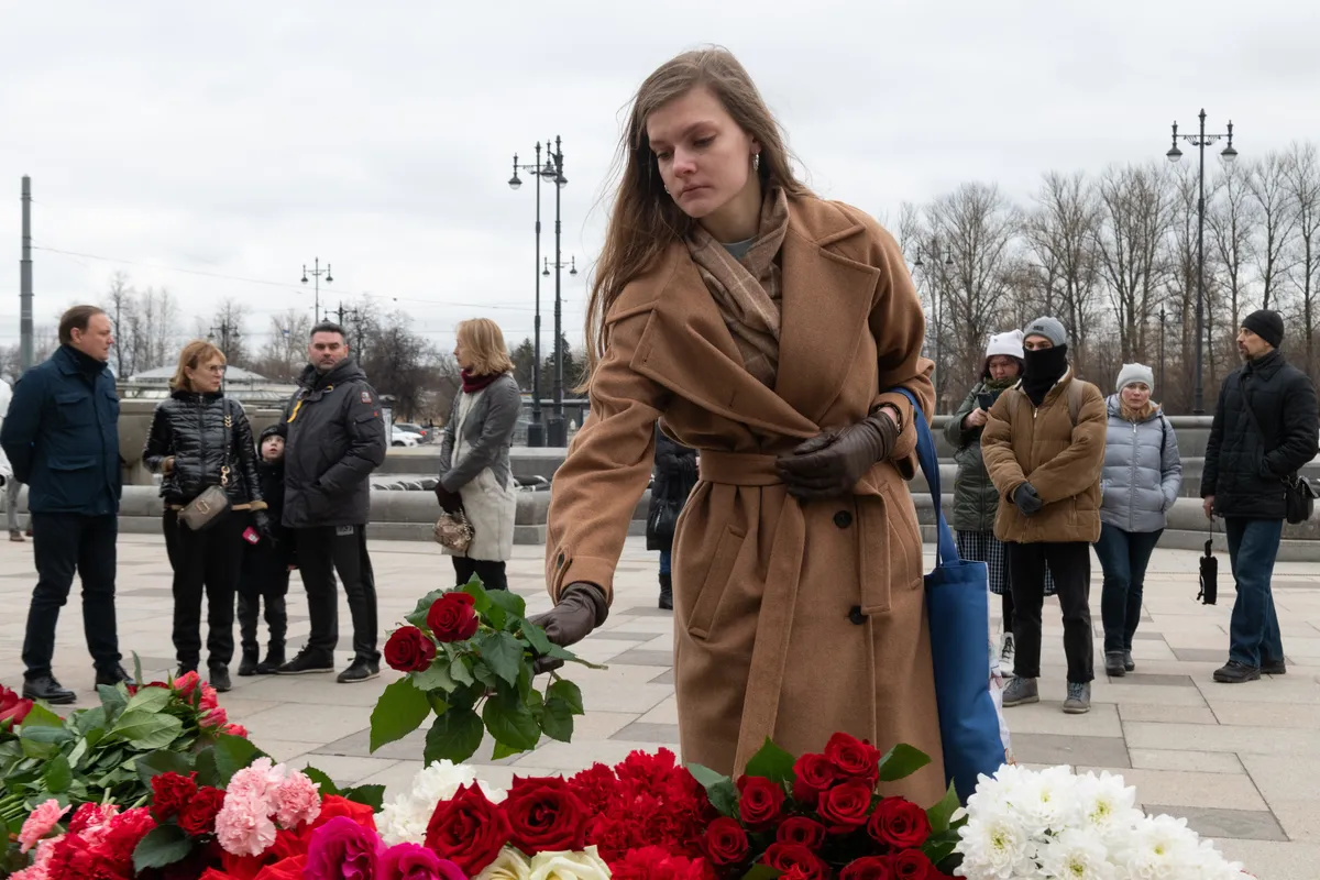 Девушка возлагает цветы к стихийному мемориалу в память о жертвах теракта в Крокус Сити Холле в Красногорске, Россия, 24 марта 2024 года. Санкт-Петербург, метро Горьковская. Фото: Stringer