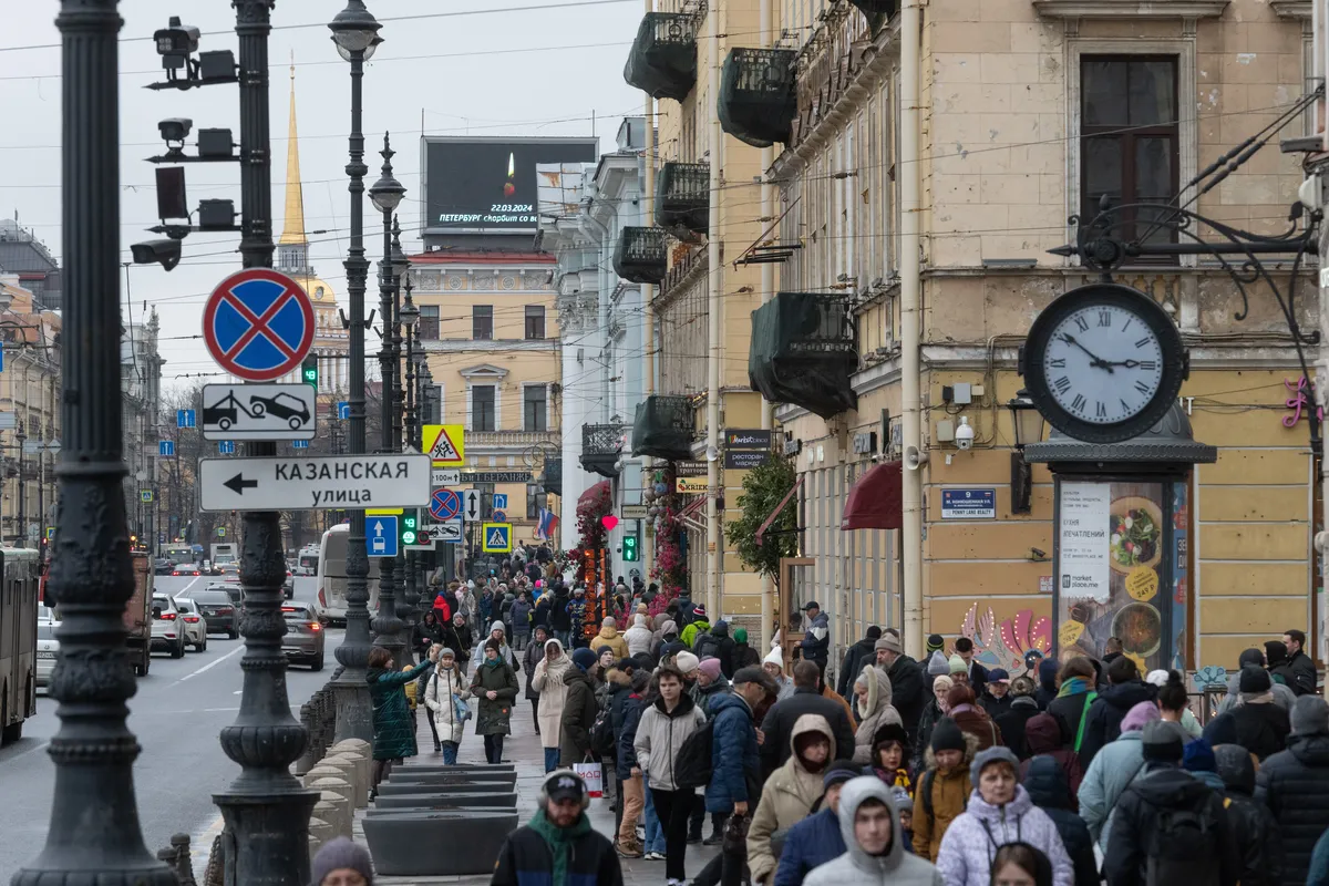 Рекламный щит транслирует траурную картинку со свечой и надписью "Петербург скорбит со всей Россией". Санкт-Петербург, Невский проспект. Фото: Stringer