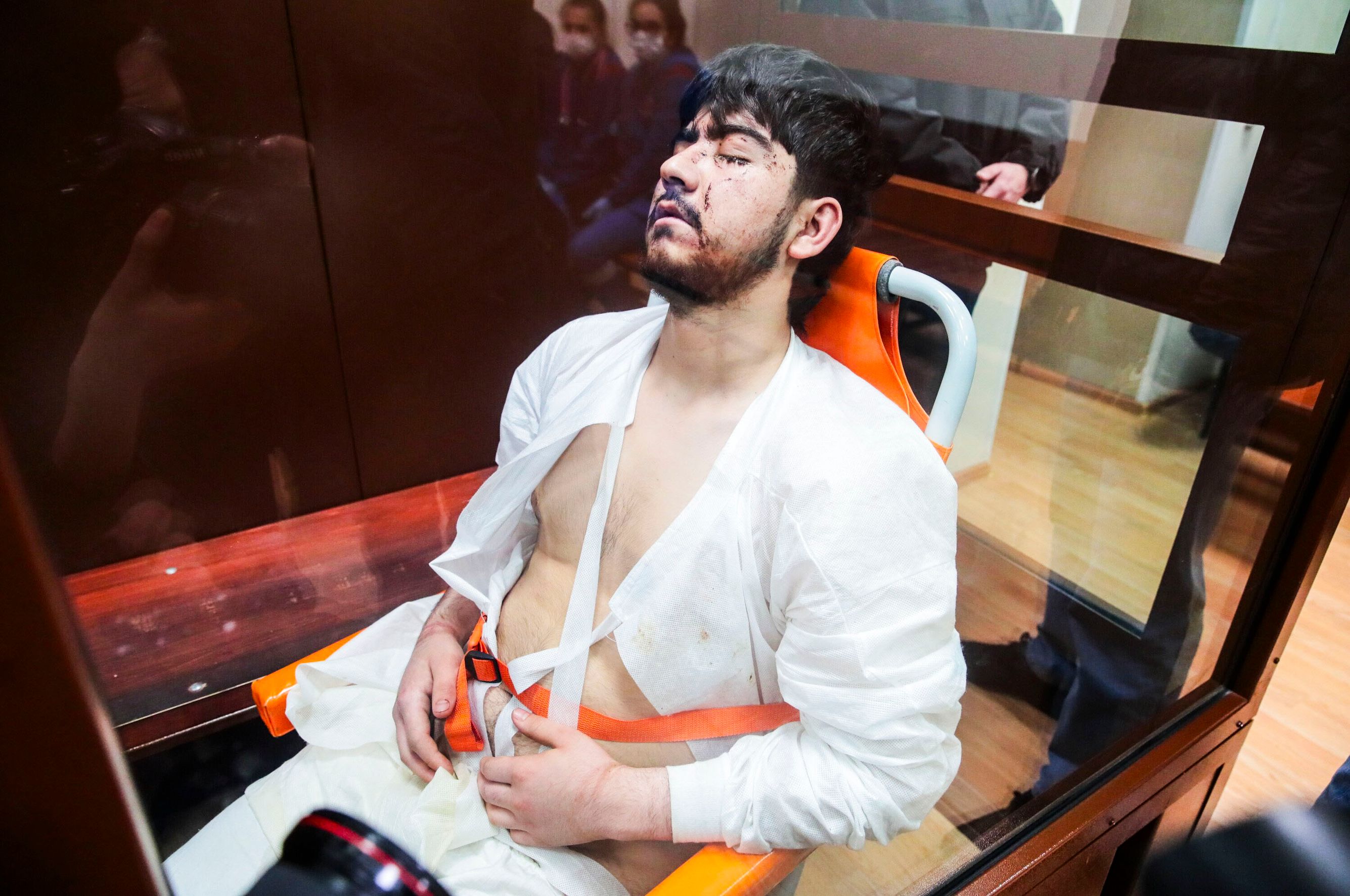 One of the defendants, Muhammadsobir Fayzov, was brought into the courtroom in a wheelchair after reportedly coming directly from the ICU. Telegram channels linked to Russia’s security services reported that he was injured “during his pursuit” by police.