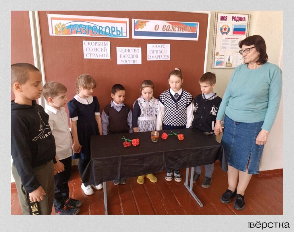 В понедельник 25 марта в школах России традиционно прошли уроки «Разговоры о важном». На этот раз они были посвящены теракту в подмосковном «Крокус Сити Холл», который произошёл 22 марта. «Вёрстка» проанализировала методические материалы и отчёты об уроках.