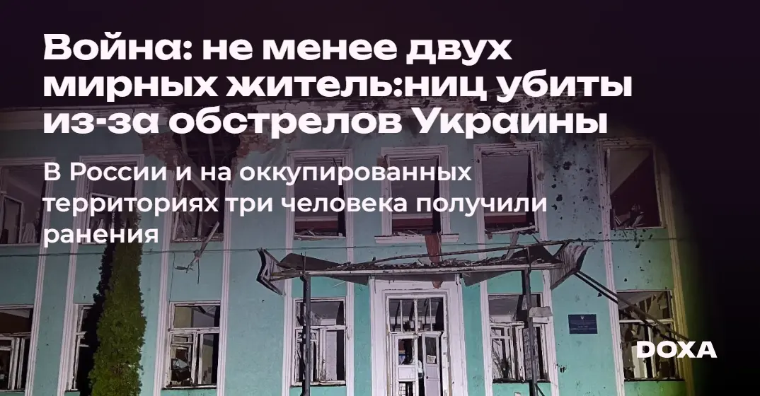 По меньшей мере две мирны:е житель:ницы Украины были убиты в результате обстрелов российской армии. Еще 20 человек получили ранения. Россия обстреляла Донецкую, Херсонскую, Харьковскую, Запорожскую, Николаевскую, Сумскую, Луганскую, Одесскую и Днепропетровскую области Украины, а также Киев, сообщили сегодня администрации этих регионов. В результате обстрелов со стороны украинской армии в России и на оккупированных территориях три мирны:е житель:ницы получили ранения, сообщили администрации регионов и оккупационные власти. Под обстрел попали ДНР, Белгородская область и оккупированная Россией часть Херсонской области.