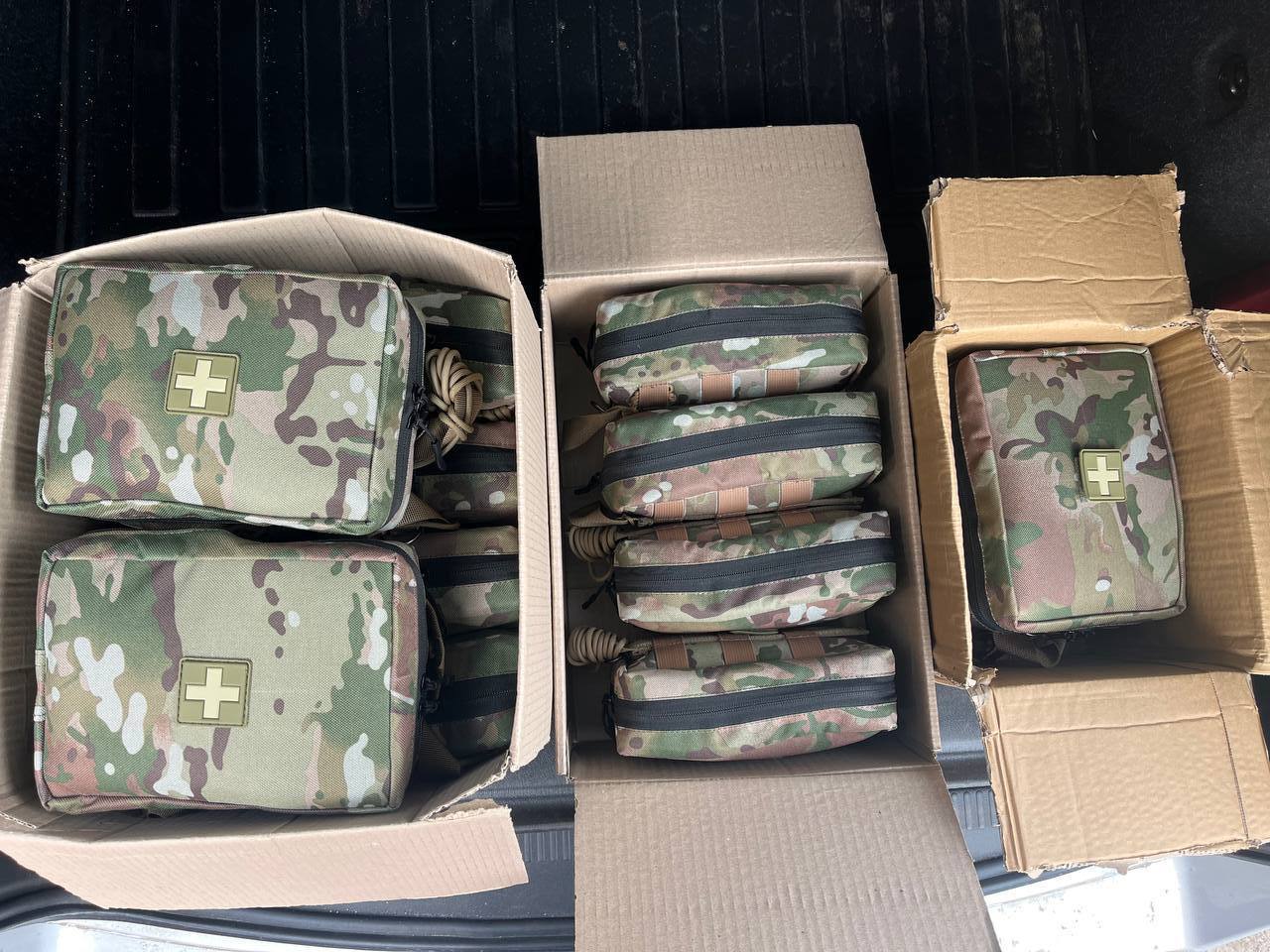 Аптечки собирает наш друг Валера из Киева. Он еще в начале войны решил делать аптечки для военных, а я разработал подсумок по желанию бойцов, чтобы его было удобно открывать и он не мешал при передвижении. Наполнение в нем стандартное, согласно приказу Минздрава Украины.