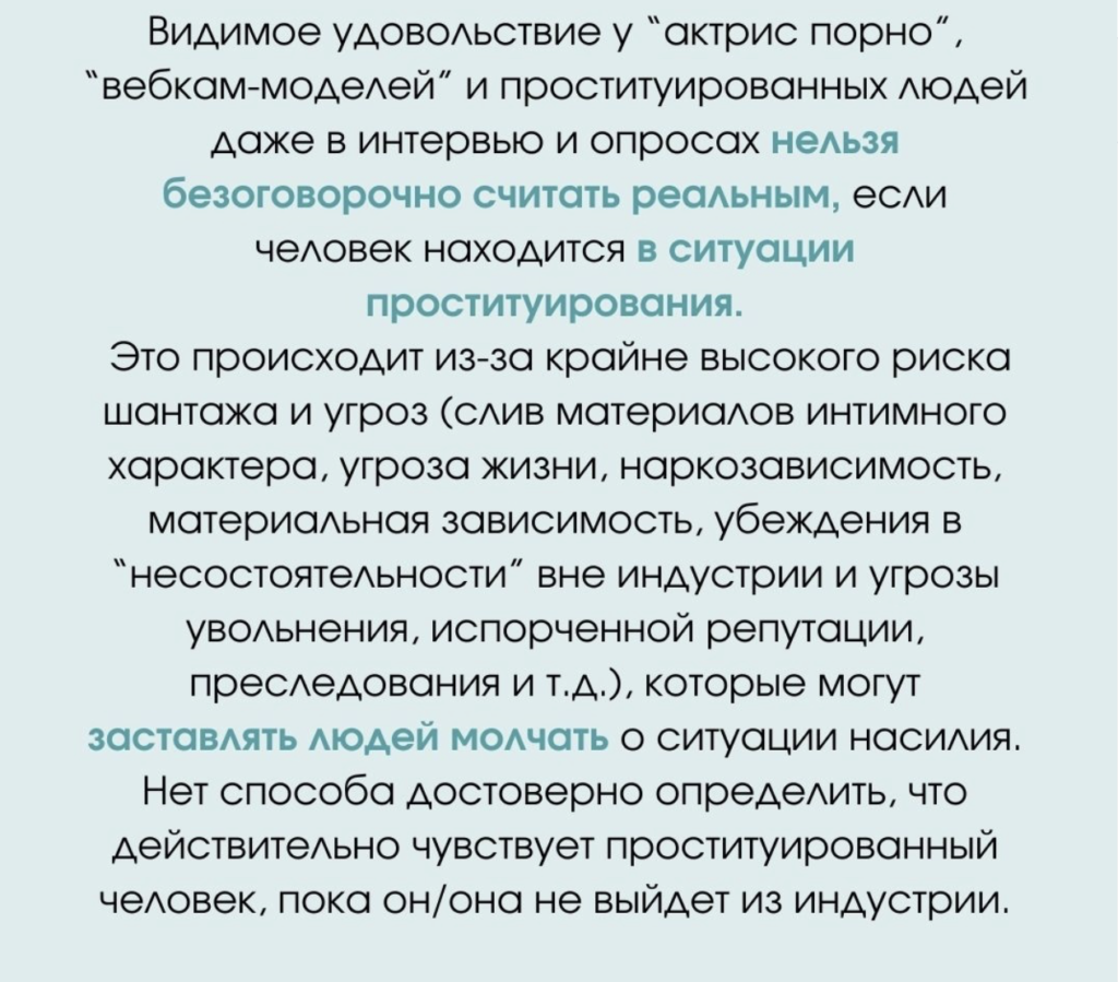 Она добавляет: если в «Эвридику» обратился человек, прямо сейчас вовлеченный в секс-индустрию, ему могут предложить план выхода. Важно, чтобы он сам хотел этого и никто не удерживал его физически. В противном случае вызволением должна заниматься полиция.