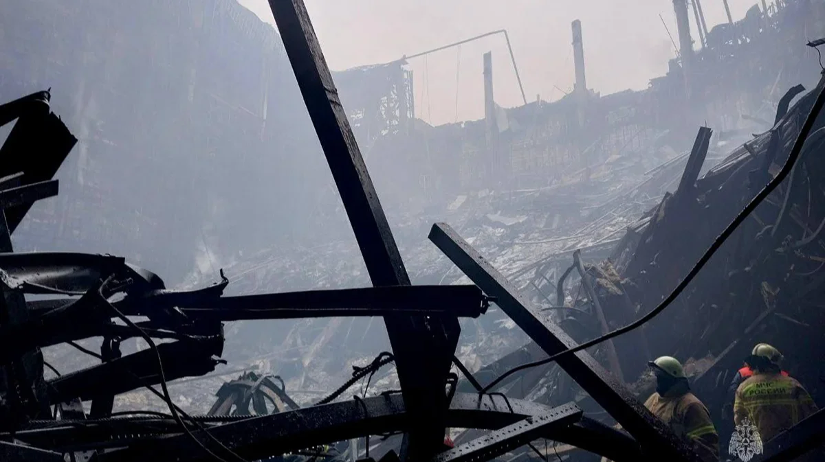 The burnt out ruins of Crocus City Hall following the concert hall terror attack on Friday. Photo: Ministry of Emergency Situations