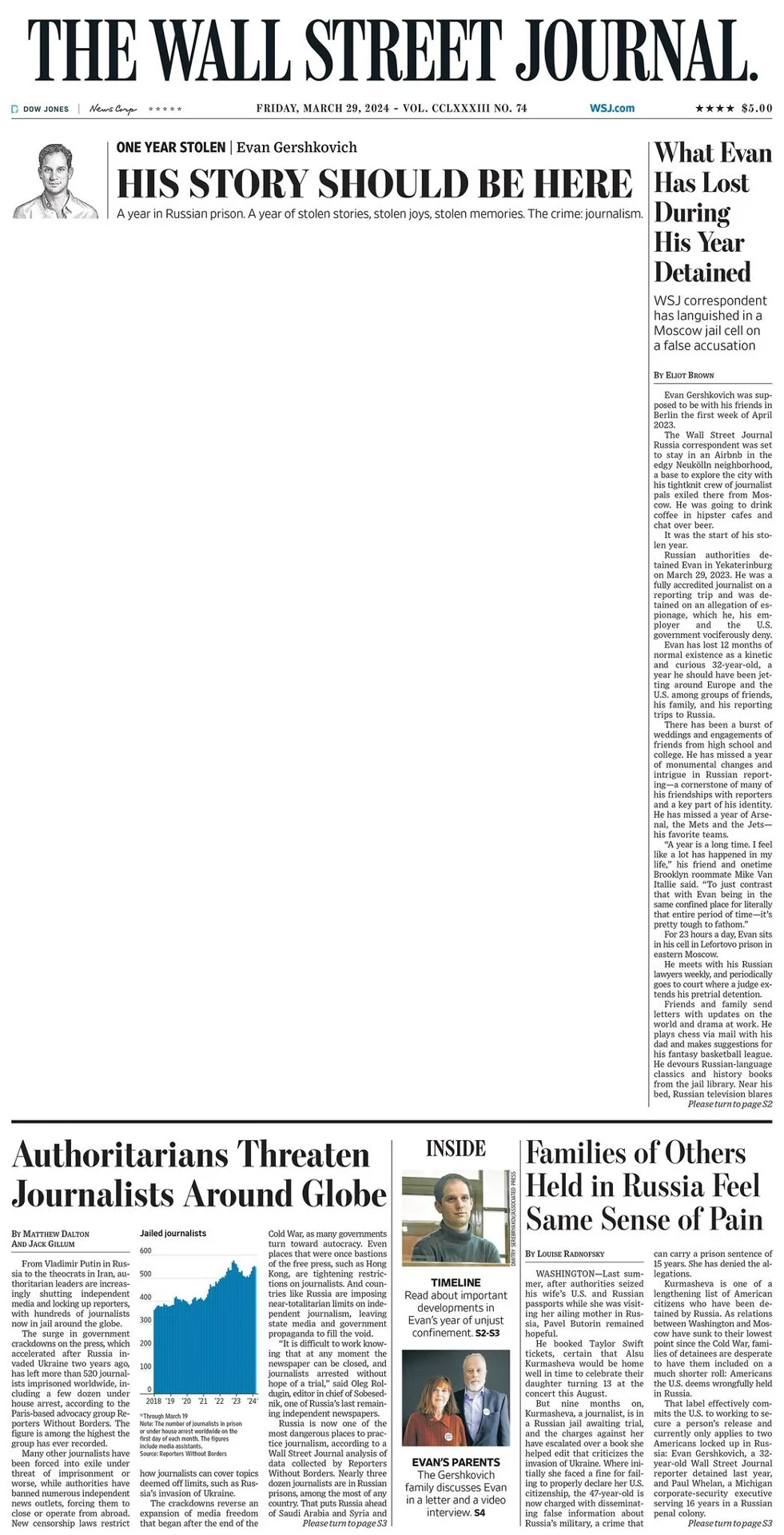 Вместе с «колонкой Гершковича» на первой полосе WSJ есть таймлайн года Гершковича в тюрьме, интервью с родителями Гершковича, заметки об угрозах журналистам по всему миру и материал редакции с заголовком «Что пропустил Эван за год в российской тюрьме по ложному обвинению».