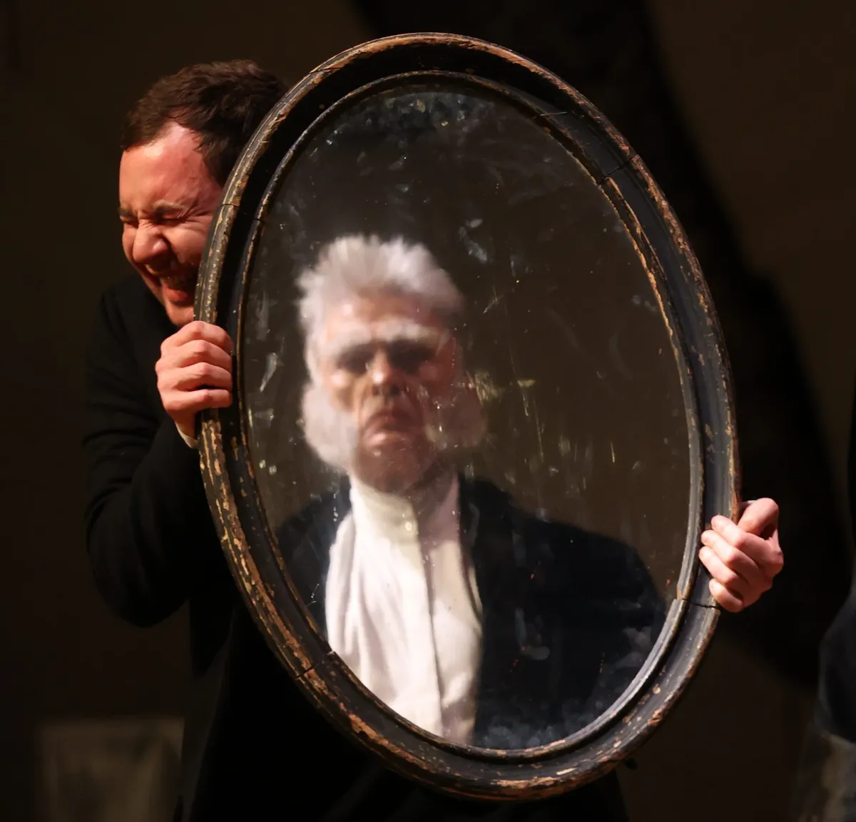 Является эта Мысль из громадного сундука в клубах дыма, в мундире с эполетами, военной шляпе с золотым позументом. И она — о правителе-карлике, зловещем и непредсказуемом. Во время спектакля Мысль пребывает в правой ложе, ярко освещенная, угрожающая, словно бы оценивающая все, что происходит.
