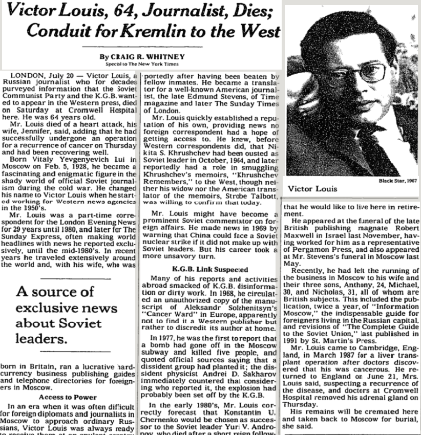 КГБ, давший "добро" на эту операцию, на советских писателей более-менее плевал с высокой колокольни. Зато он таким образом сразу "убивал двух зайцев". Виктор Луи становился для западных журналистов важнейшим информатором, через которого можно узнавать о реальной жизни в СССР (а, значит, можно и "сливать" на Запад нужную информацию). А для каких-нибудь диссидентов, в свою очередь, Луи теперь представлялся практически борцом за свободу слова и мог в известной мере пользоваться их доверием. Конечно, и те и другие догадывались, что к делу причастен КГБ. Но скажите, к чему он не был причастен?