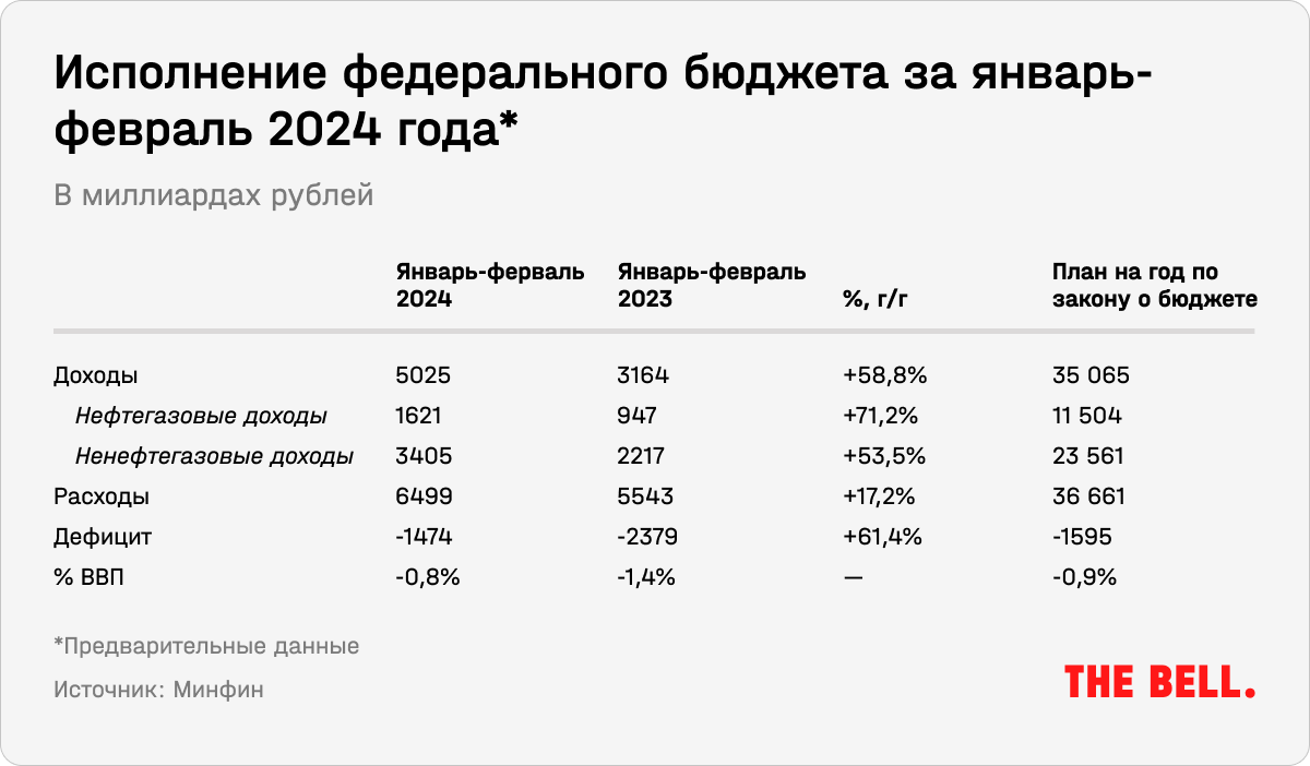За первые два месяца 2024 года расходы бюджета составили почти 6,5 трлн рублей — на 17,2% больше, чем за тот же период прошлого года. За этот короткий срок государство на 18% выполнило весь годовой план по расходам, а дефицит бюджета вплотную приблизился к плану на весь 2024 год. При плановом дефиците в 1,6 трлн рублей по году к концу февраля он уже составил почти 1,5 трлн или 0,8% ВВП.