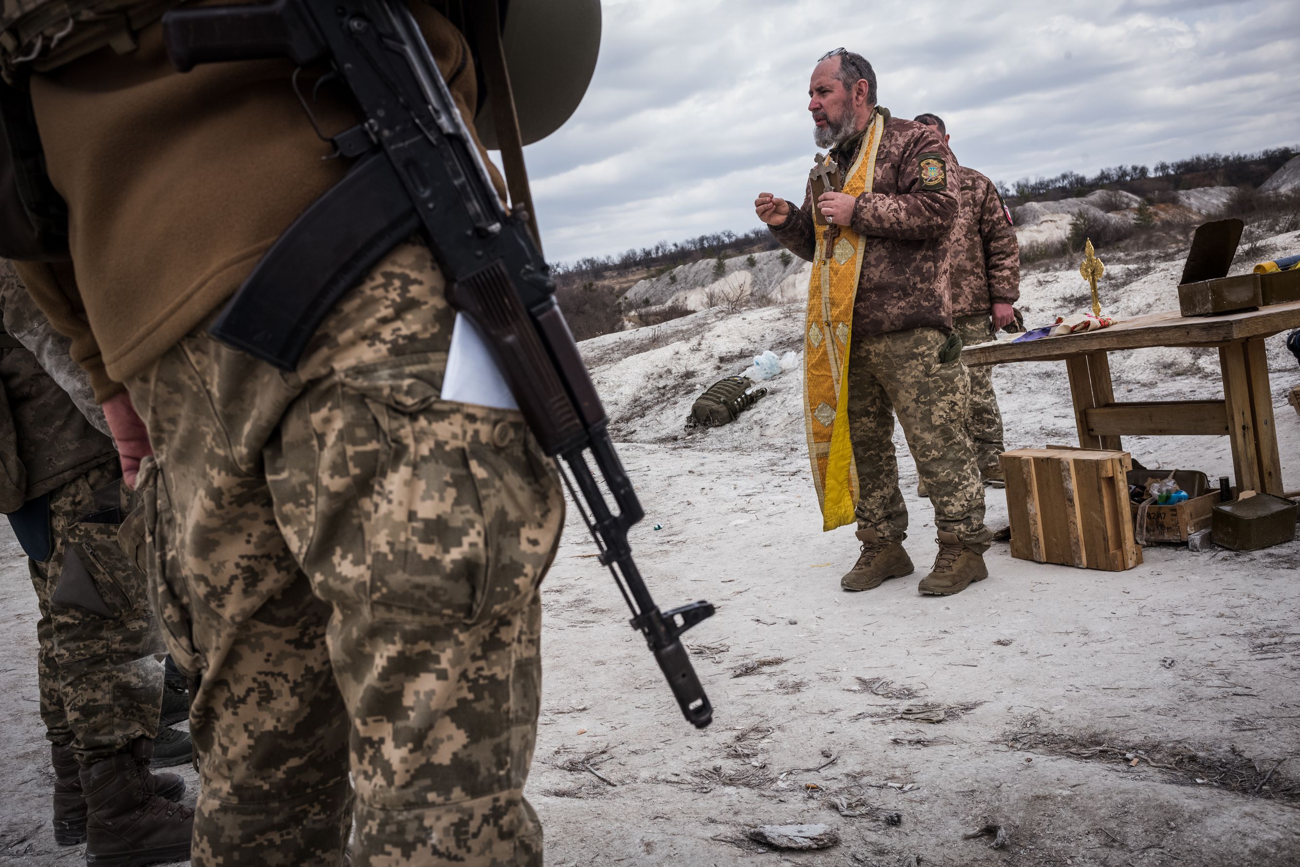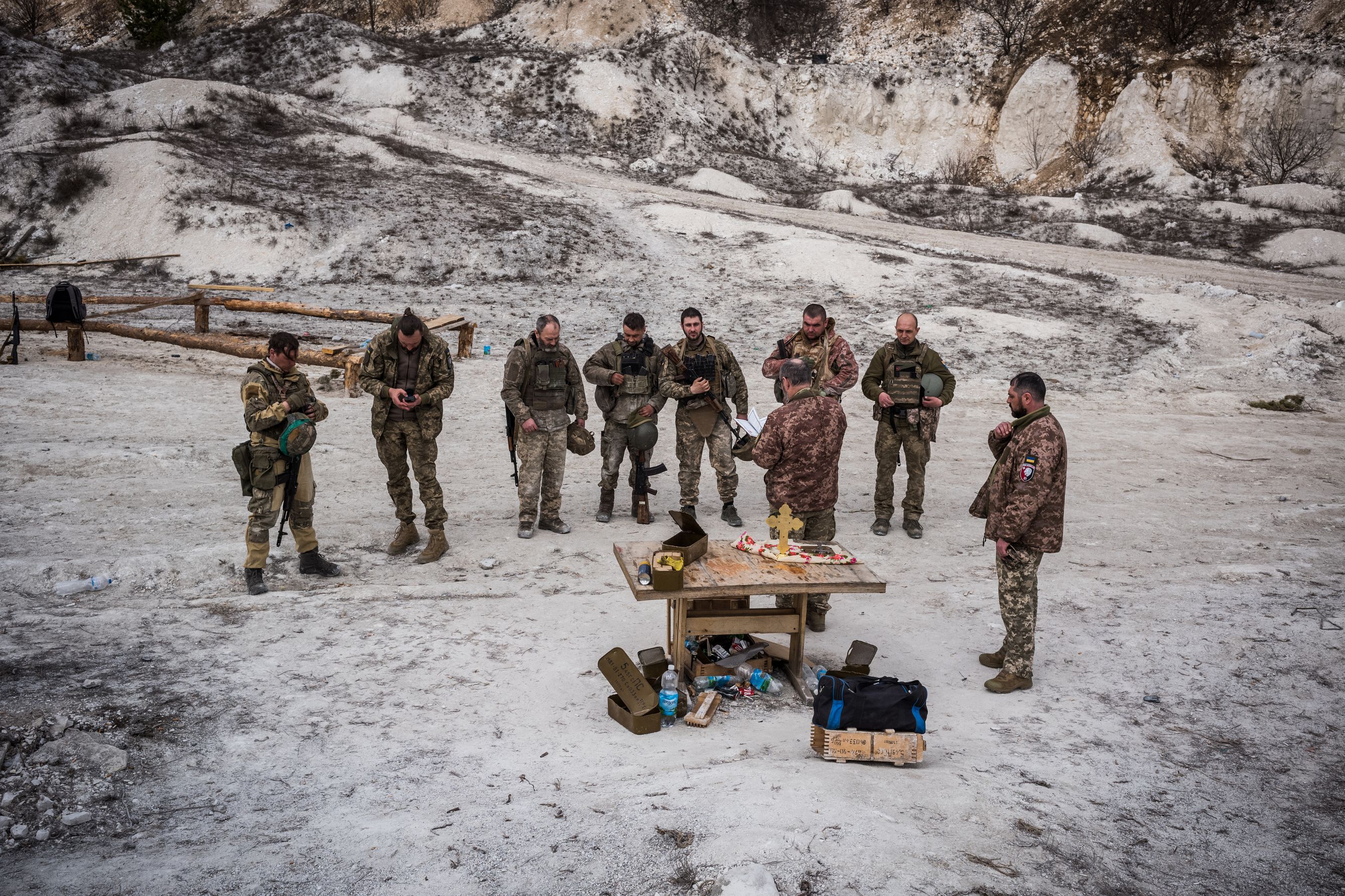 Военнослужащие ВСУ молятся вместе с военным капелланом в Донецкой области