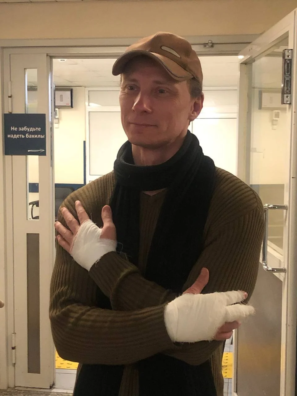 — Мы работали у дома родителей Фаворской, там проводился обыск. И один из представителей так называемой власти напал на меня. Схватил меня, бросил на землю и стал избивать. Результат вот такой (поднимает обе забинтованные руки) — разбитая голова, ссадины, выкрученные пальцы, растяжения. Нога поврежденная — тоже растяжение.
