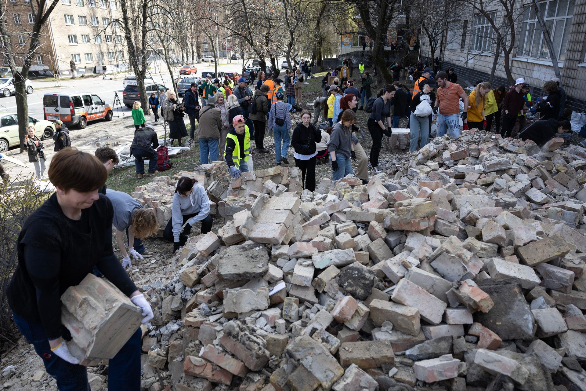 Студенты и преподаватели художественной академии в Киеве разбирают завалы на месте одного из корпусов