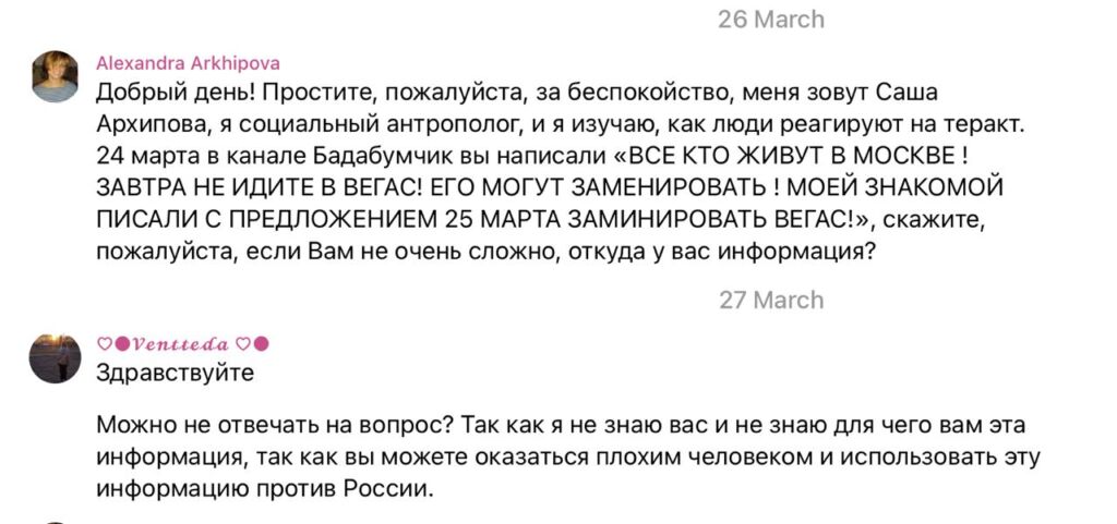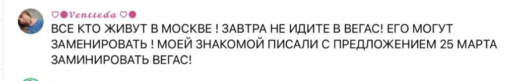 На вопрос одного из авторов этой статьи, откуда у нее информация о заминированном «Вегасе», Ventteda5 решила не отвечать, так как спрашивающий может «оказаться плохим человеком». Судя по фотографии на аватарке, а также по стилю и орфографии письма, вряд ли это взрослый человек.