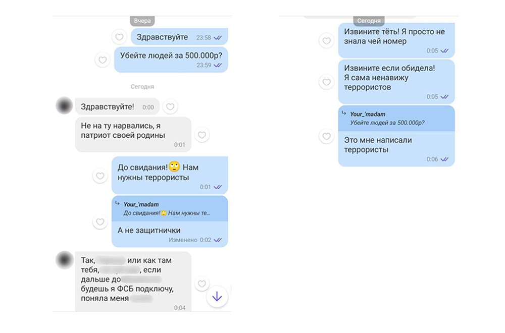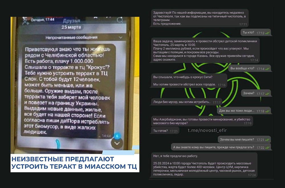 Началась паника. Появлялись все новые и новые сообщения, в которых «вербовщики» предлагали школьникам атаковать общественные места в Москве, Петрозаводске, Миассе, Чистополе, Смоленске, Пскове, Крыму и Луганске и во многих других городах. В текстах назывались разные объекты и суммы.
