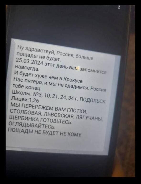 После страшного теракта в подмосковном «Крокусе» страну охватила паника. Люди пытаются контролировать неконтролируемое и предупреждают друг друга о реальных и вымышленных угрозах. Паника усилилась после массовой рассылки сообщений, в которых якобы вербовщики террористов (то ли исламистов, то ли украинского подполья) предлагают школьникам взорвать магазины, школы, поликлиники за 500–700 тысяч рублей. Представители силовых структур говорят о том, что «наши дети оказались целью украинских вербовщиков». А 28 марта полиция задержала трех школьников 15, 14 и даже девяти лет, которые сделали эту рассылку ради шутки. В отношении двух из них открыты уголовные дела.