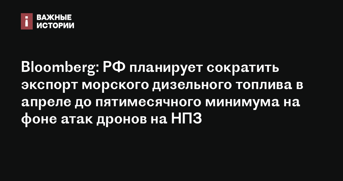 Bloomberg: РФ планирует сократить экспорт морского дизельного топлива в апреле до пятимесячного минимума на фоне атак дронов на НПЗ