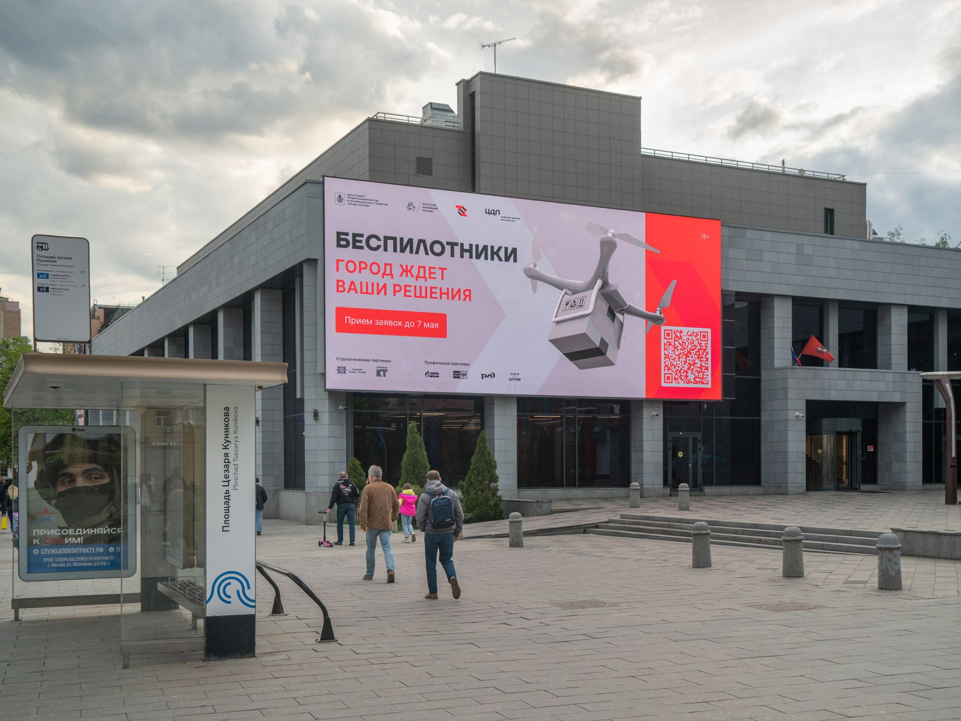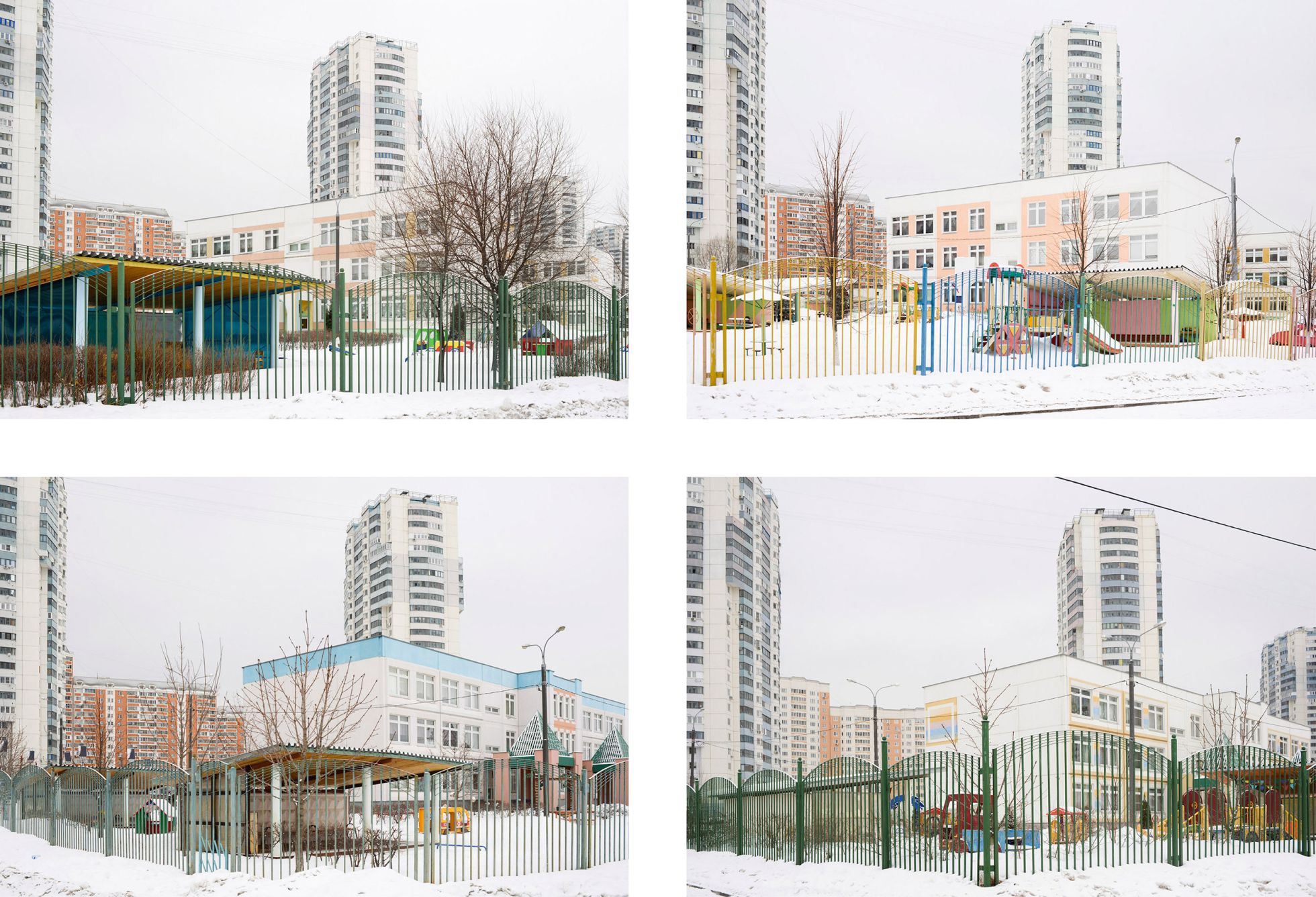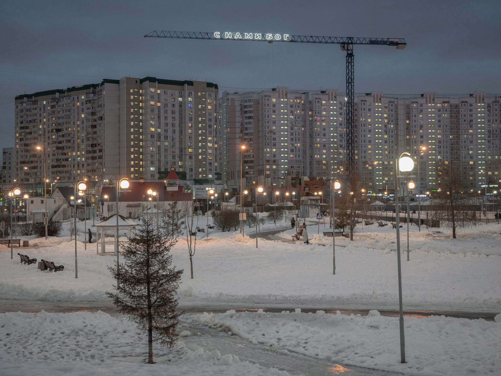 Точно такую же ситуацию фиксирует Гронский. «Патриотические» экраны и билборды с милитаристскими и не только милитаристскими лозунгами как будто по недоразумению попали на его снимки: городская среда никак не коррелирует с идеологией, это параллельные, стилистически разные пространства. Часто фотограф снимает пропаганду издалека, чтобы она растворилась в равнодушном пейзаже. Кажется, единственное высказывание, которое выглядит органично на московских улицах, — лаконичное «сейчас», пойманное Гронским на одном из мультимедийных фасадов.