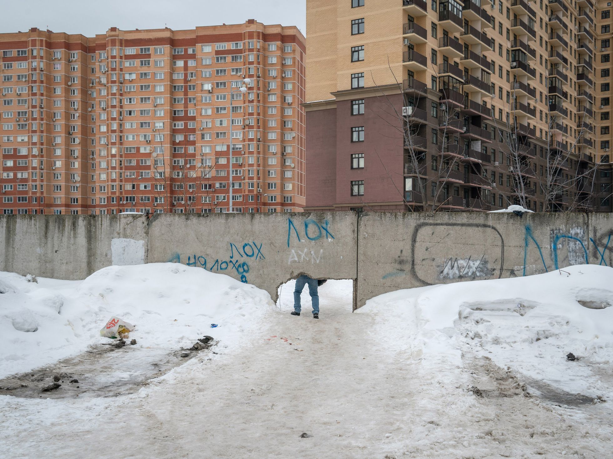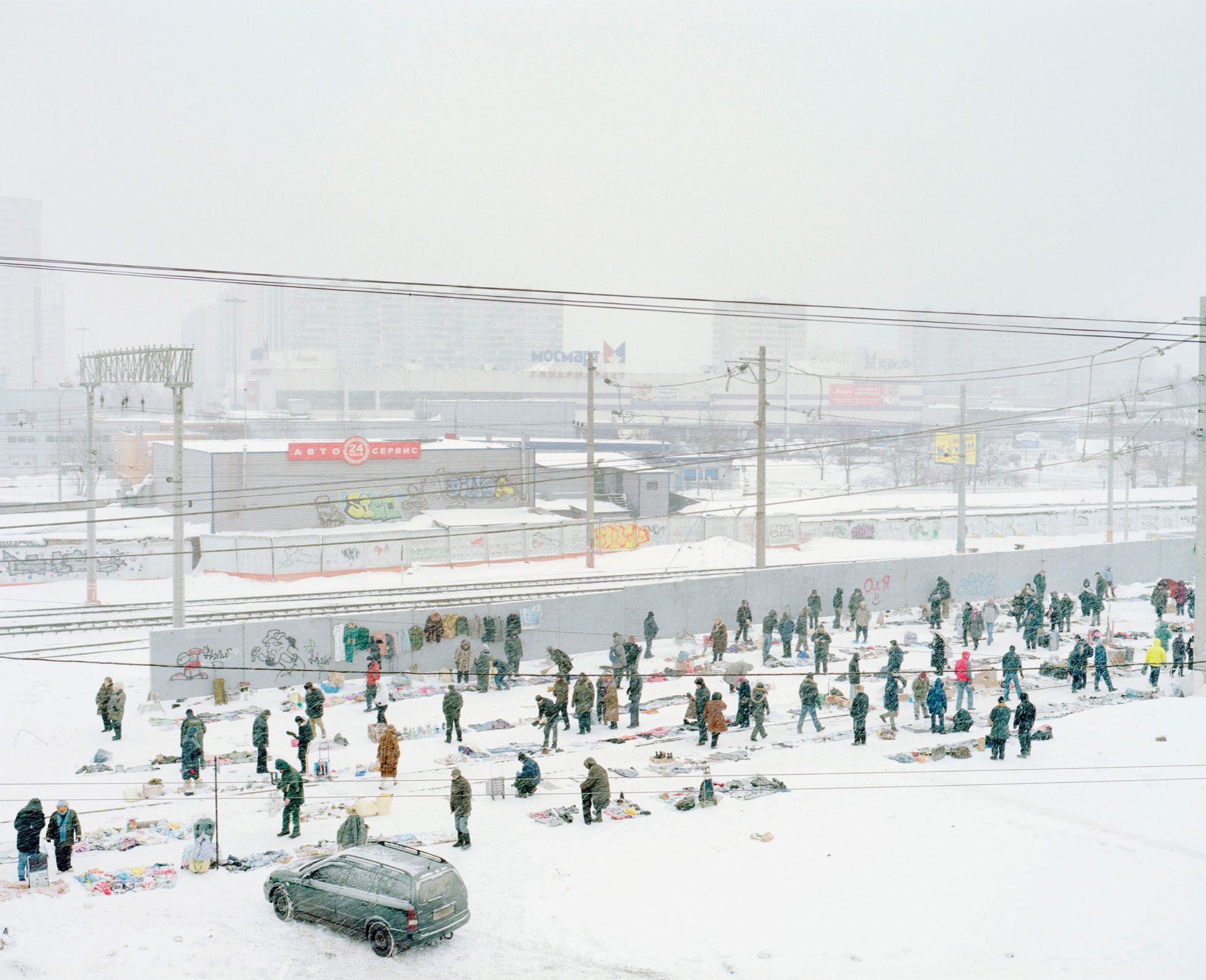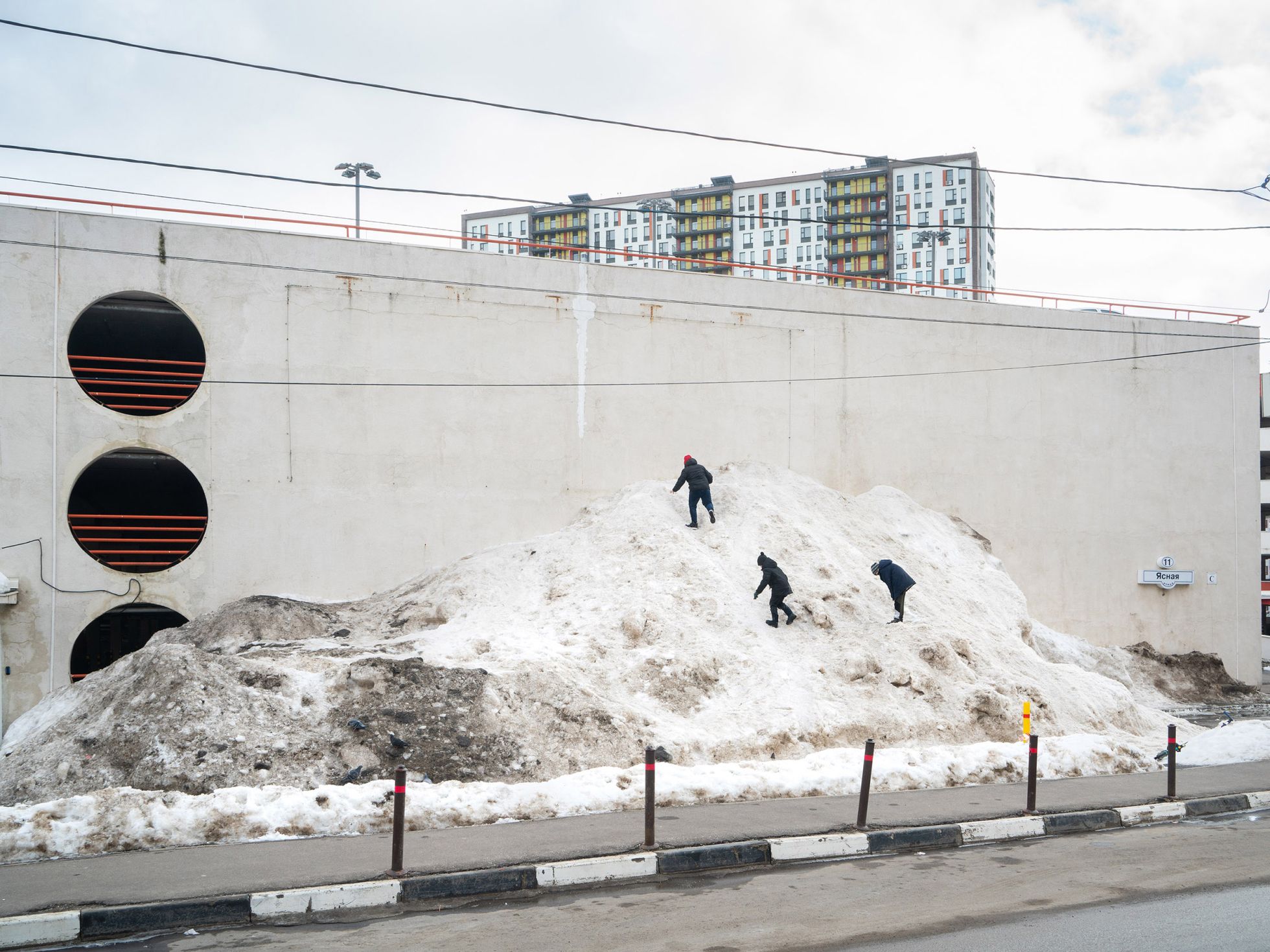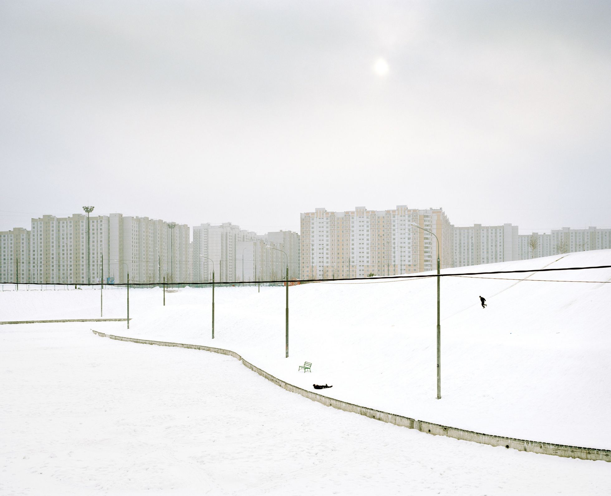 Герой Гронского — это коллективный герой. Например, москвичи вообще. С 2008 по 2010 год фотограф снимал московскую периферию для проекта «The Edge» («край» с английского). На многих из этих зимних снимков отчетливо видно, где заканчивается город — ровно там, где начинается снег. Зритель может вообразить, что за пределами Москвы лежит пустота — настолько белый снег у Гронского в кадре.