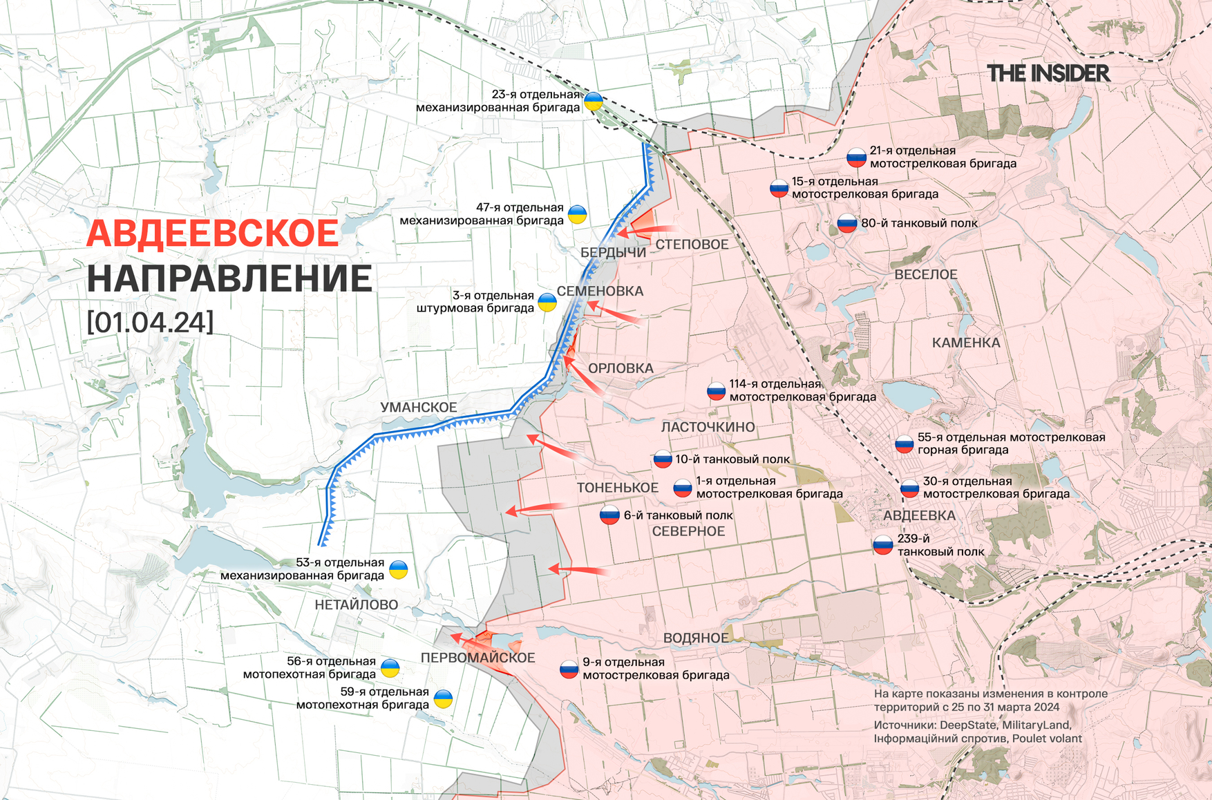 Украинский военный под ником Kriegsforscher пишет о неудачном наступлении 30 марта механизированной колонны противника под Тоненьким западнее Авдеевки по направлению на Уманское ( геолокация ). По его данным, в колонне насчитывалось 36 танков и 12 БМП , из них 12 танков и 8 БМП были подбиты. В соцсетях 25-й отдельной воздушно-десантной бригады ВСУ выложено видео с одним из эпизодов отражения этой атаки.
