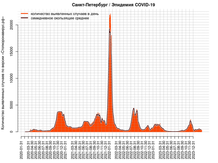 Максимальное число подтвержденных заражений COVID-19 в Петербурге было в январе и феврале 2022-го — до 22 тысяч подтвержденных случаев COVID-19 в день. Последний максимум приходится на август 2022-го — до 4,5 тысяч заболевших в день, затем заболеваемость идет на спад и больше не достигает таких значений.