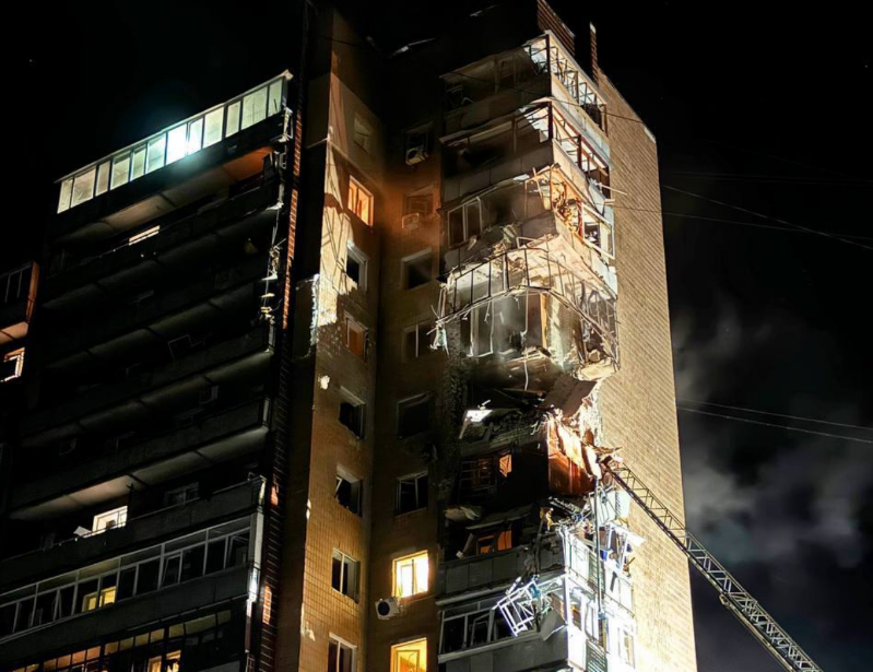 Один из дронов попал в 14-этажный дом, в результате несколько квартир были разрушены, погибла 68-летняя женщина. В Новобаварском районе дрон попал по трехэтажному дому. Когда спасатели прибыли разбирать завалы, была совершена повторная атака на жилой дом, погибли трое спасателей.