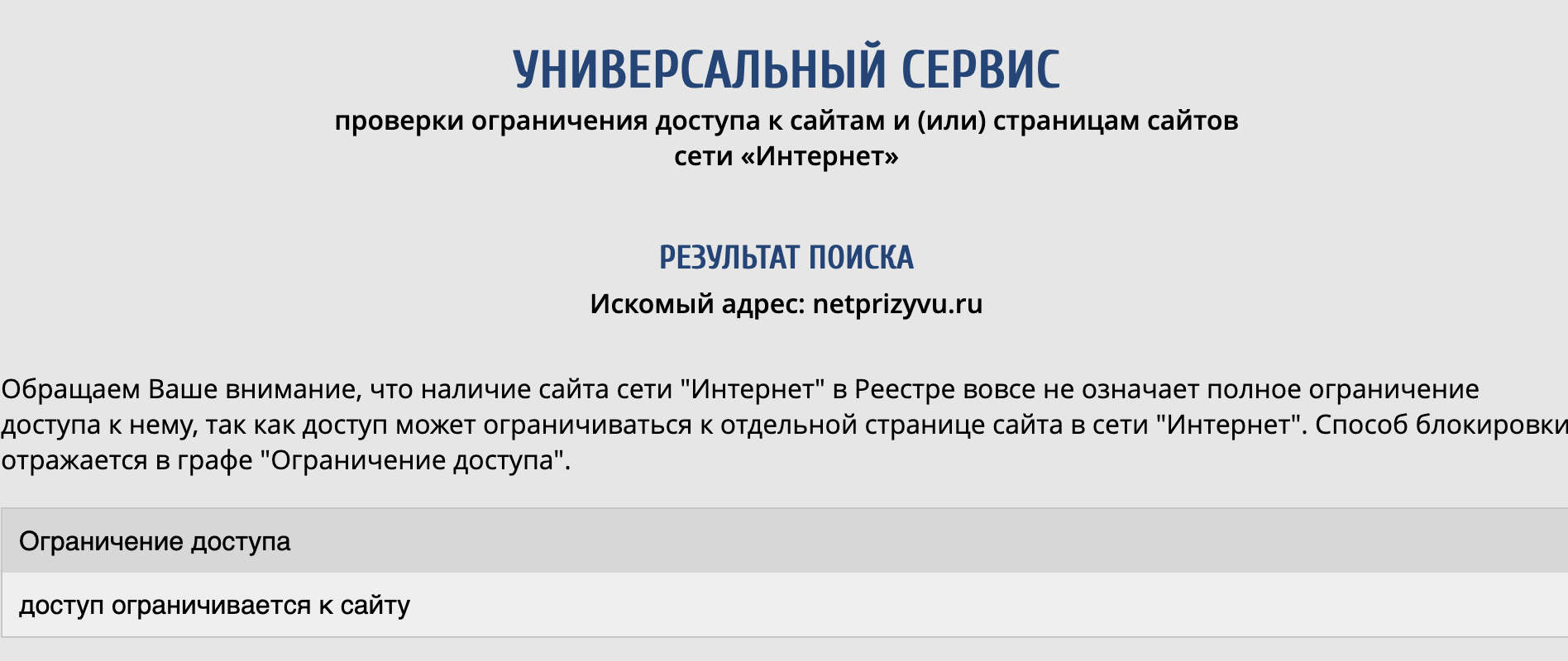 Роскомнадзор заблокировал сайте netprizyvu.ru правозащитного проекта «Школа призывника», сообщается в канале организации.