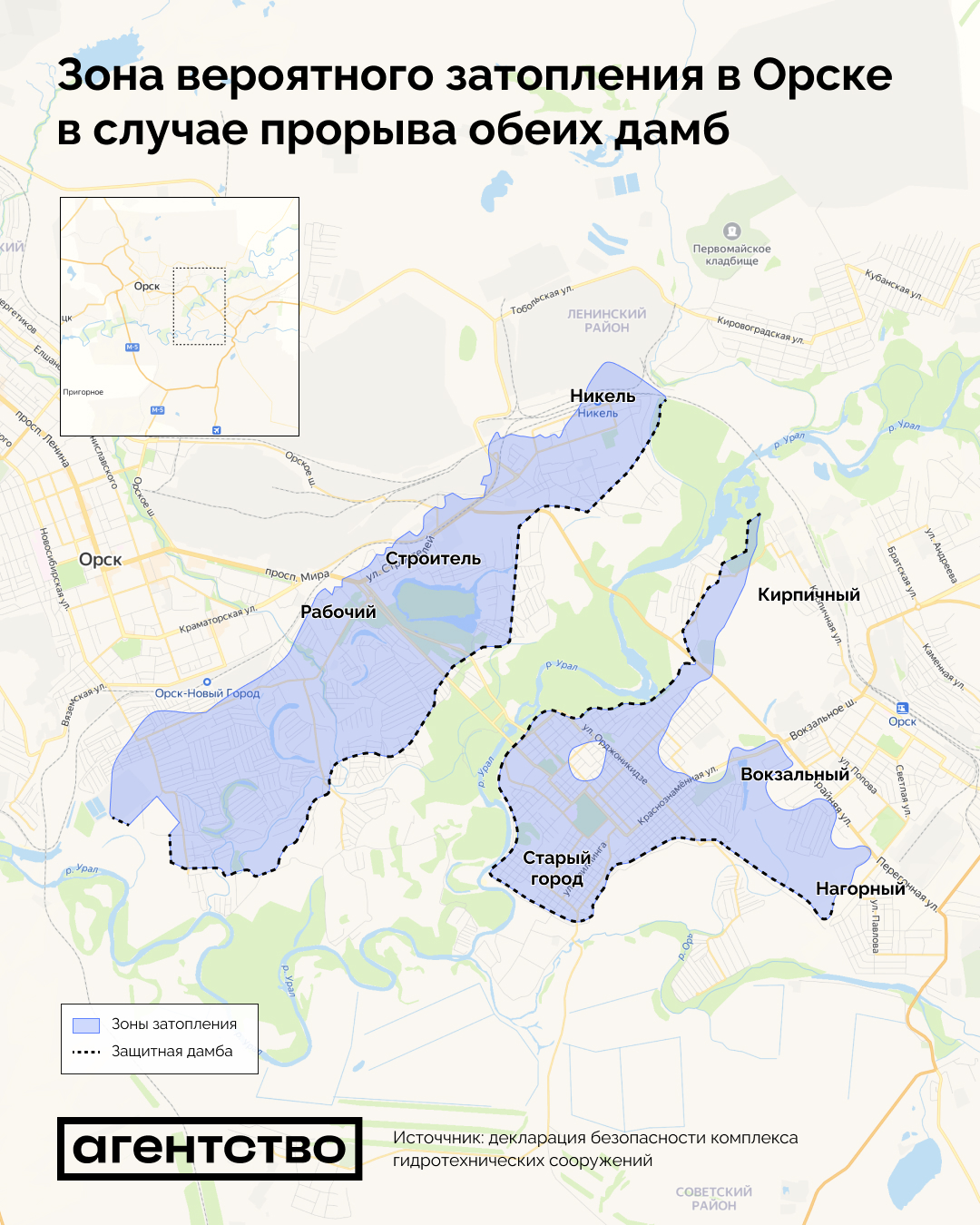 В Орске прорвало обе защищавшие город дамбы. В паспорте дамб говорится, что такой сценарий будет иметь «катастрофические» последствия, а ущерб превысит 5 млрд рублей