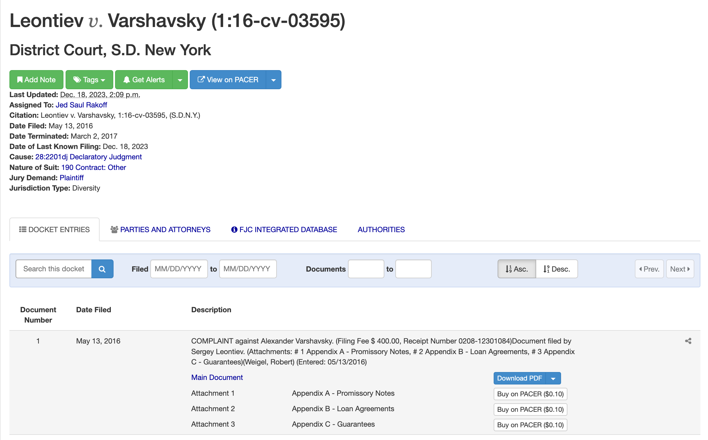 В основном эти базы наполняются документами из официальной базы данных федеральных американских судов Pacer. Если рядом с документом активна кнопка «Download PDF», значит, создатели Courtlistener и RECAP уже выкачали документ и выложили его в открытый доступ. Кнопка «Buy on Pacer» ведет на страницу платного скачивания непосредственно из Pacer. Для такого скачивания в Pacer сначала нужно зарегистрироваться и дождаться письма из США с логином и паролем по бумажной почте. Раньше такие письма не быстро, но доходили и в Россию. Сейчас лучше найти знакомых в других странах и зарегистрировать аккаунт на них. Расценка на скачивание фиксированная — 10 центов за каждую страницу. Количество страниц известно заранее. Иногда в документе 5–10 страниц, а иногда — показания на сотню листов.
