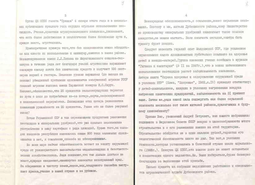 «Наконец, общеизвестно, — говорилось в письме, — что 20% сельхозпродукции теряется по пути с поля до потребителя из-за потерь, порчи, несвоевременной и некомплексной переработки. Ликвидация этих потерь равнозначна повышению урожайности на 20%. Разве это не более разумный выход?» При этом ровенцы подчеркивали, что «почвы Украинской ССР и так перенасыщены продуктами разложения пестицидов и минеральных удобрений, что уже сделало невозможным употребление в пищу картофеля с ряда площадей». И указывали: «На складах колхозов республики накопилось свыше 900 тонн залежалых ядохимикатов и нет, к сожалению, способа их обезвреживания».