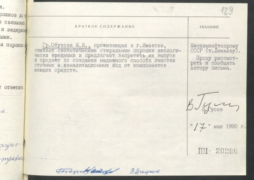 Некоторые обращения советских граждан к властям по экологической тематике были, скажем так, своеобразны. В частности, в апреле 1990 года на имя Михаила Горбачева поступило письмо от жительницы Ижевска Марии Обуховой. Женщина хотела добиться от лидера советского государства запрета на продажу синтетических стиральных порошков.