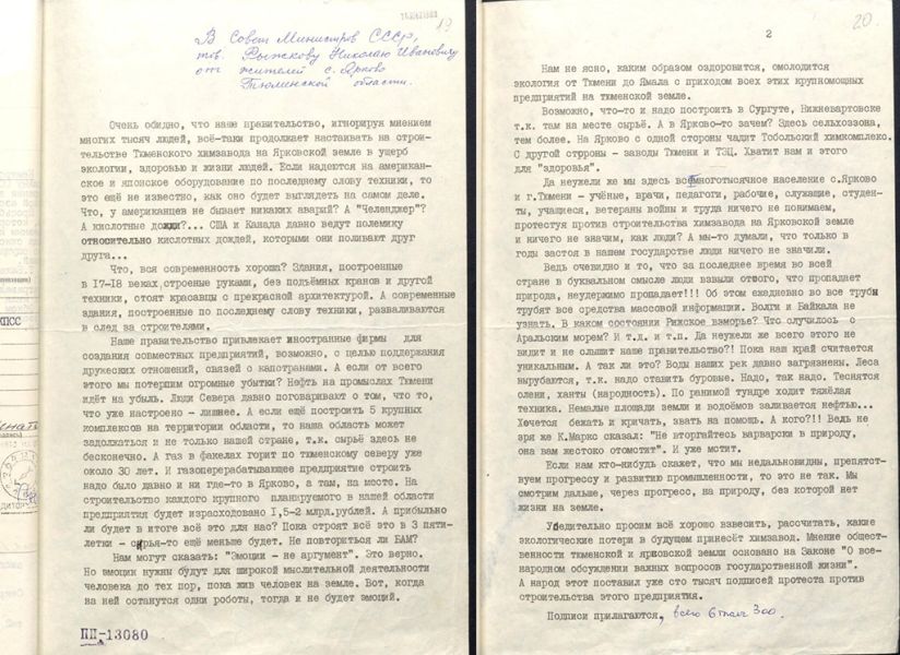 Тогда же, в 1988 году, до Совета министров дошел и другой протест: жители тюменского села Ярково были обеспокоены планами разместить вблизи их домов нефтехимическое производство. Судя по письму селян главе правительства Николаю Рыжкову, вопрос размещения промышленного предприятия уже обсуждался, люди сказали свое «нет», но власти все равно решили, что завод должен быть построен. В качестве успокоения ярковцам пообещали, что оборудование на нем будет импортным.