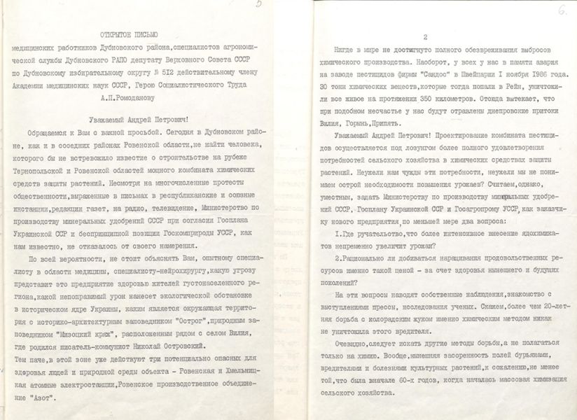 «Сегодня в Дубновском районе, как и в соседних районах Ровенской области, не не найти человека, которого бы не встревожило известие о строительстве на рубеже Тернопольской и Ровенской областей мощного комбината химических средств защиты растений», — писали люди. Обращаясь к Ромоданову, они заявляли: «Не стоит объяснять вам, специалисту в области медицины, специалисту-нейрохирургу, какую угрозу представит это предприятие здоровью жителей густонаселенного региона, какой непоправимый урон нанесет экологической обстановке в историческом ядре Украины».